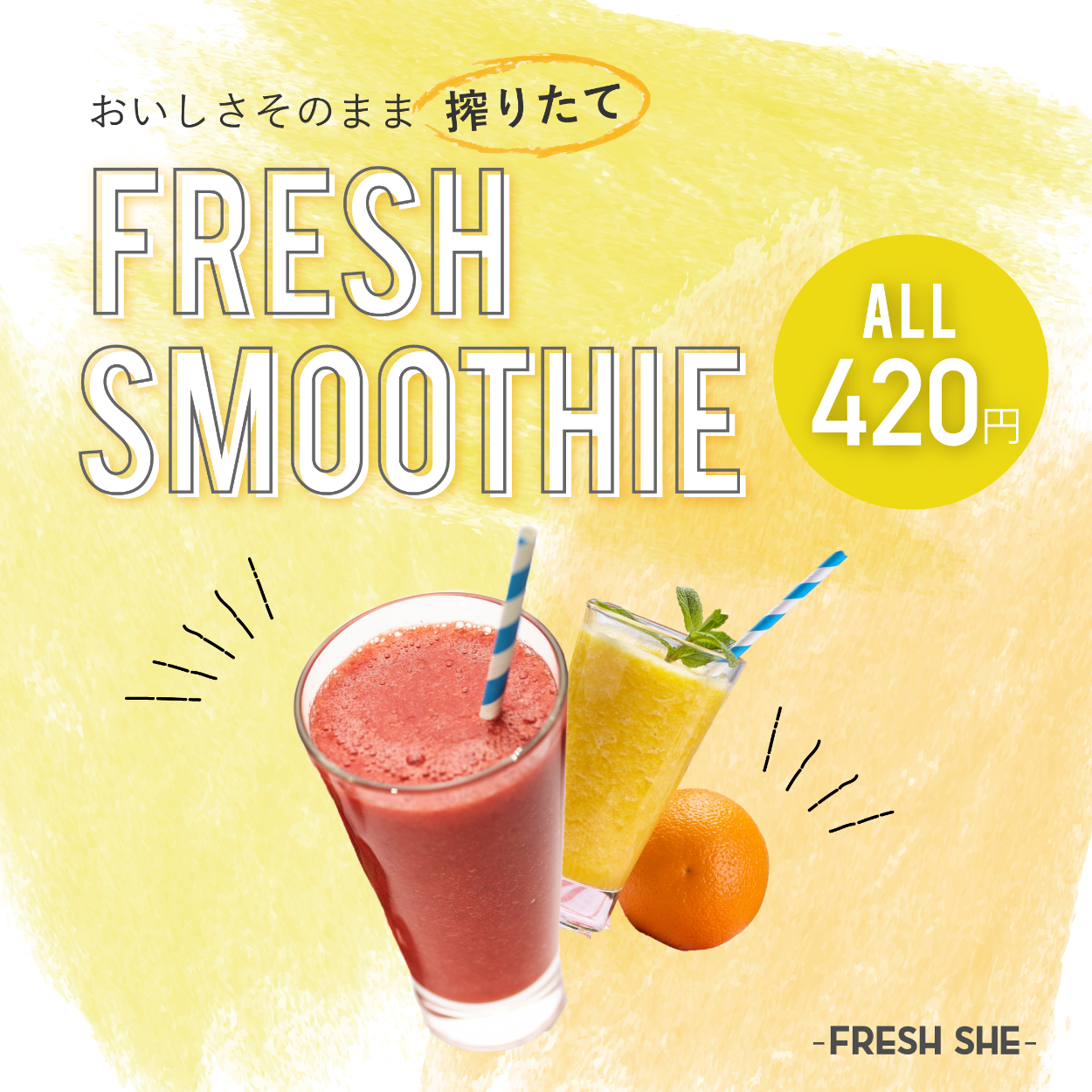 - 入れて欲しい内容 ①フレッシュスムージー ②ALL420円 ③キャッチコピー ④店名