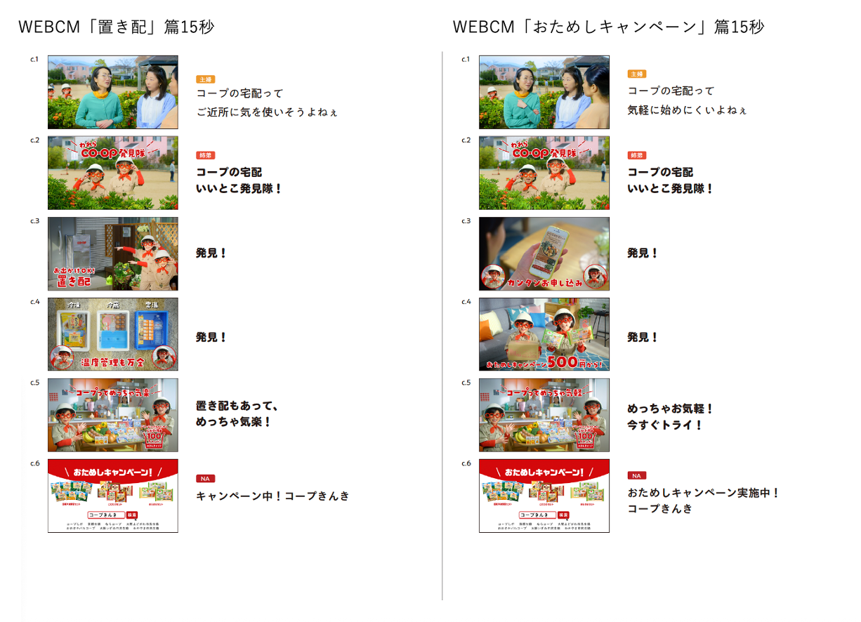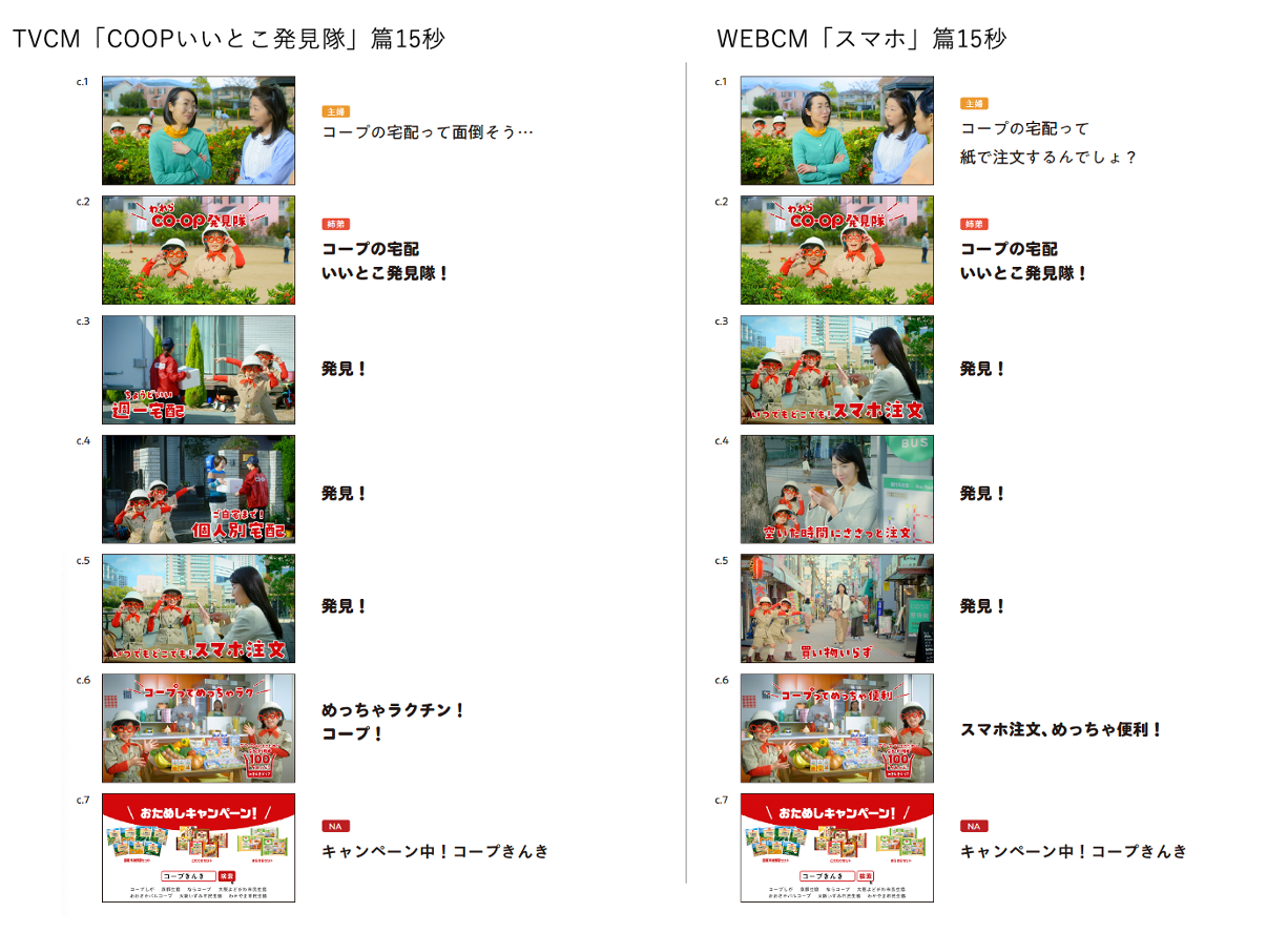「共同購入」や「在宅受取」のイメージが強い生協の宅配。そんな誤認によるネガティブなイメージを「いいとこ発見隊!」という表現フレームで解消し、ポジティブなメリットに転換するCMを目指した。WEBCMでは個人宅配の魅力をより掘り下げた内容で展開。