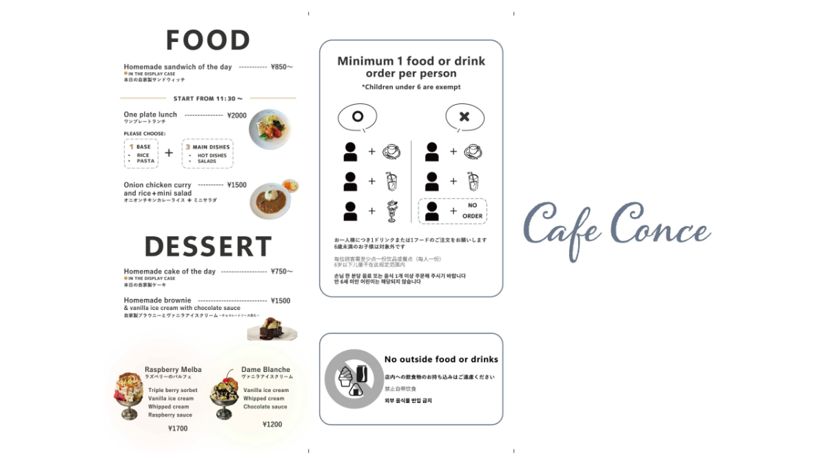 ☞よくある質問を事前に解消できる構成にワンオーダー制・飲食物持ち込み禁止を、