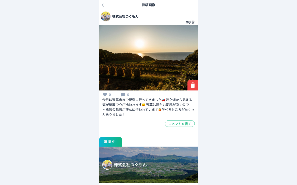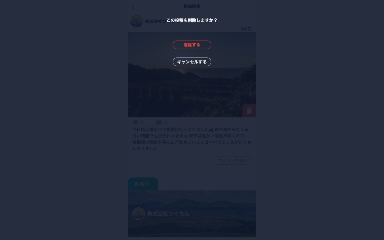 投稿したユーザーが投稿の詳細を表示した場合、画像の右下に削除ボタンが表示されます。