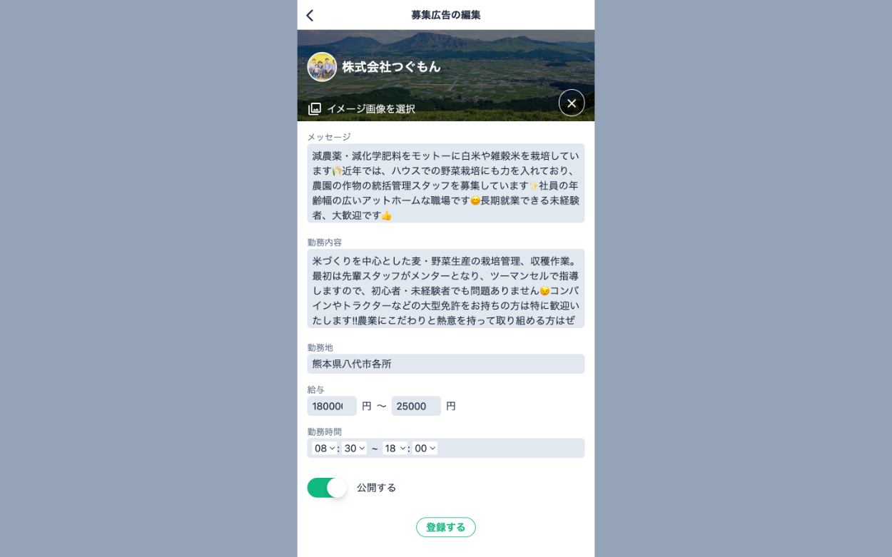 求人支援アプリ つぐもん は、そんな思いつきから作られた、地元と移住者をつなぐアプリケーションです。