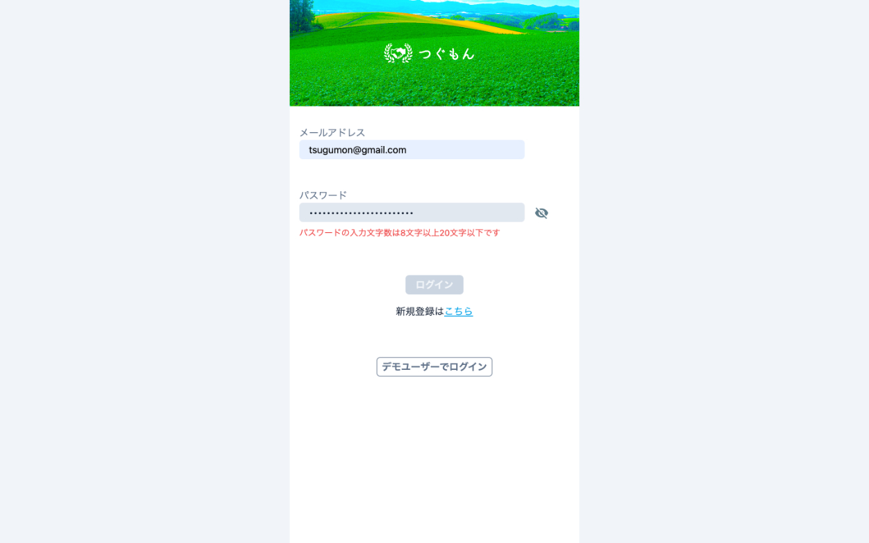 入力規則を満たさない場合、フォームの下にアラートを表示するようにしました。また、パスワードの表示・非表示を切り替えることができます。
