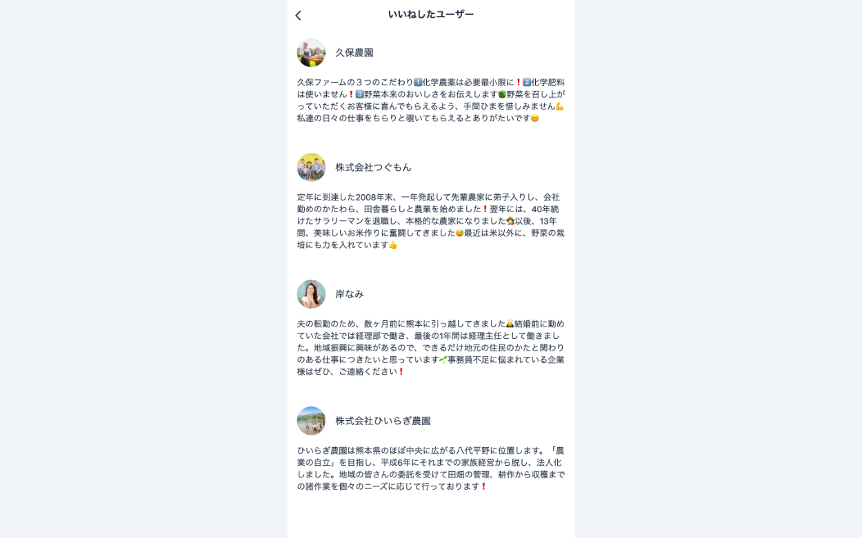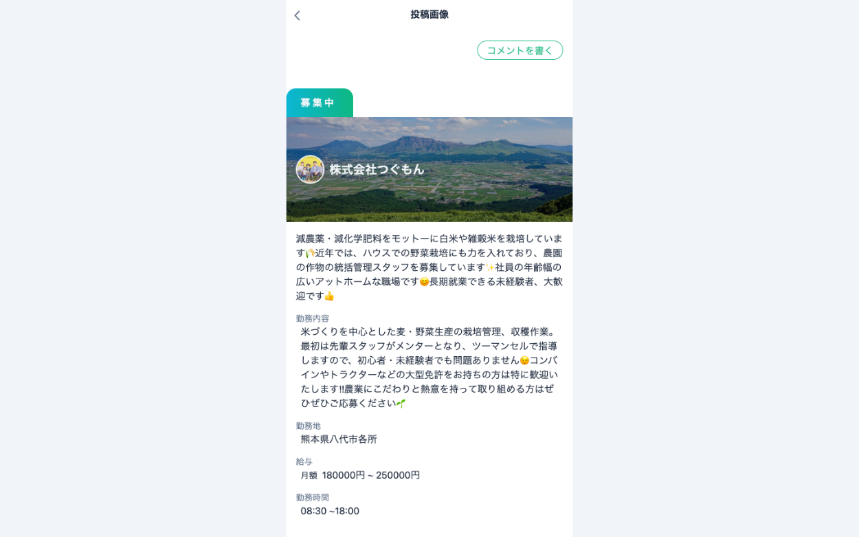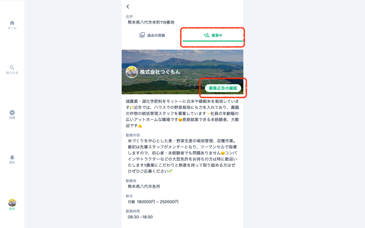 企業ユーザーは日々の仕事内容や、求人広告を載せることで、移住者に対して情報発信することができ、一般ユーザーは地元企業の仕事について、具体的にイメージを掴むことができます。