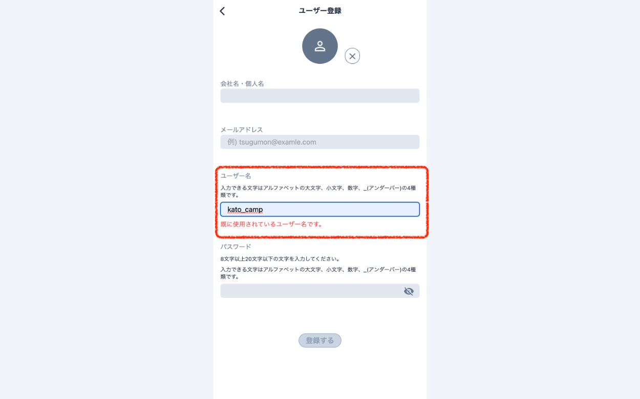 入力されたユーザー名が既存のものと重複していた場合、警告を表示するようにしました。