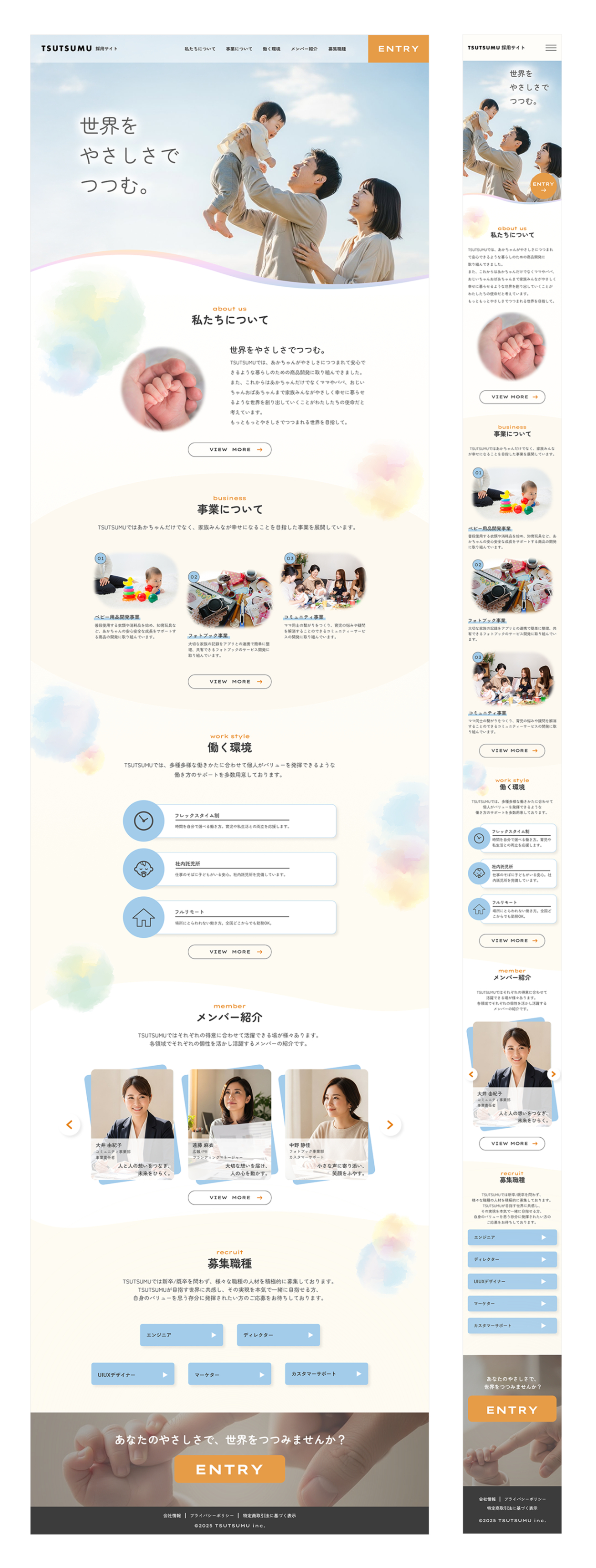 ・全体を明るく包み込むような配色にすることで、家族や子どもに関わるサービスとしての親しみやすさと信頼感を演出。