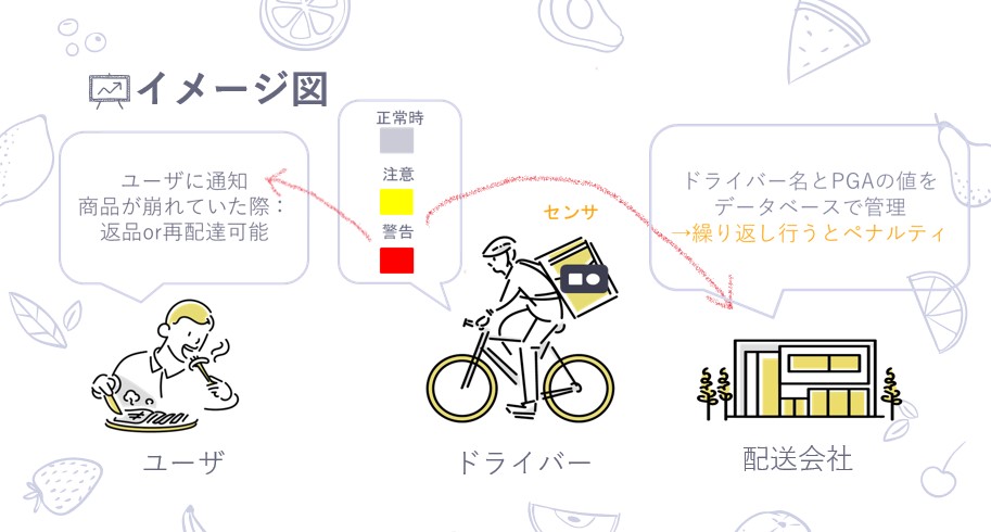 商品の崩れの主な原因はドライバーによる”揺れ”である。現状この問題について明確な対策はなく、多くのデリバリーサービスはその業務形態からドライバーの意識に対して対処することが難しい状態である。 そこで、IoTセンサを用い商品の揺れを感知することで運営がドライバーの配達状態を把握することのできるシステムを構築しようと考えた。