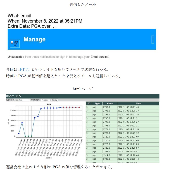 使用したセンサは”環境センサ 2JCIE-BU01 ”である。ドライバーのかばん等にいセンサを装着し、センサの加速度を測定する項目の PGA を利用し て、PGA が一定値を超えると、運営会社、ドライバー、利用者に通知する。