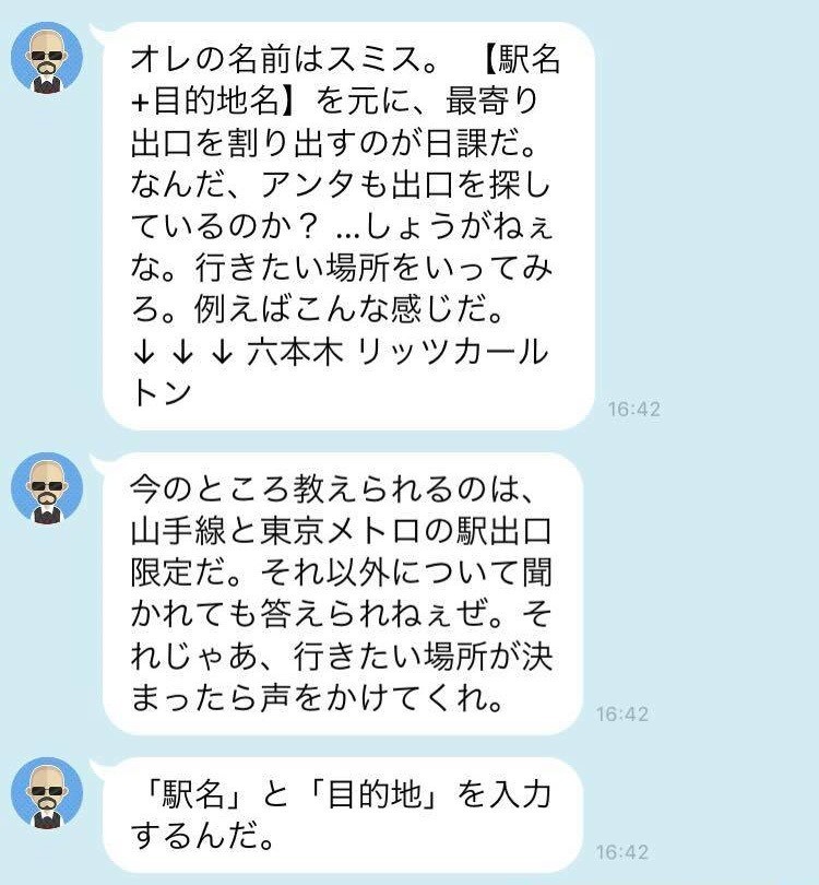 駅の案内掲示板はちょっとわかりにくいし、急いでるときは「降りてすぐ目的の出口にダッシュしたい!」みたいなことが多々あります。そんなニーズを解決すべくLINE BOTで手軽に最寄り出口を教えてくれる「スミスの出口案内」を実装しました。