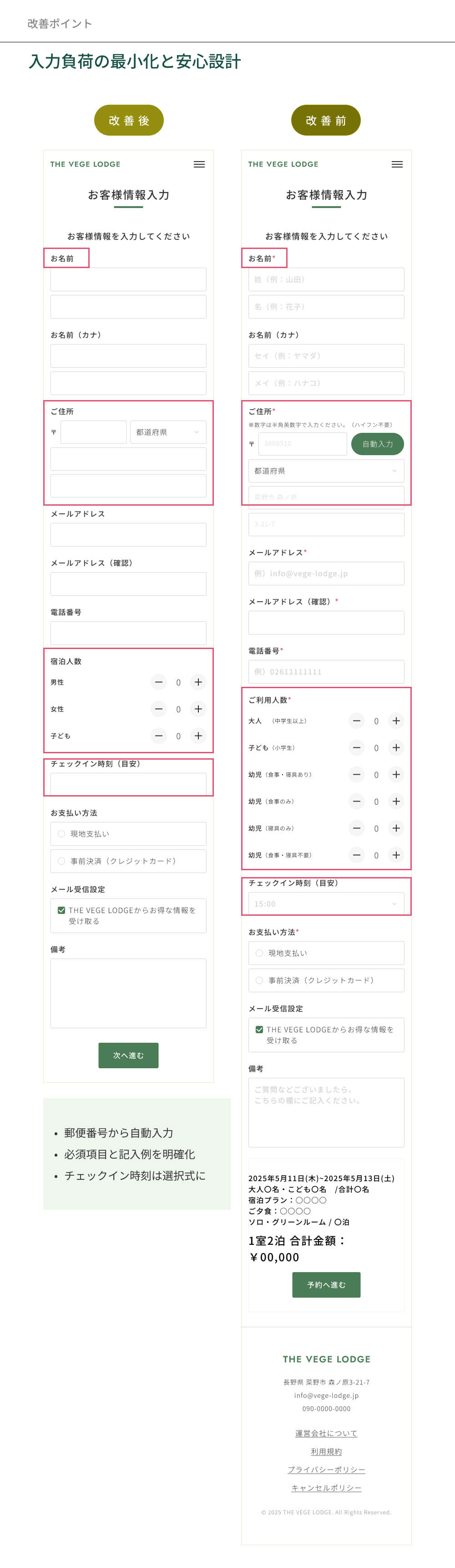 改善策として、必須項目に赤字の*マークを付与し、各項目に記入例を表示することで、ユーザーの入力時の迷いを徹底的に解消しました。特に、郵便番号からの住所自動入力機能と、時刻をドロップダウンにすることで、入力の手間を削減。