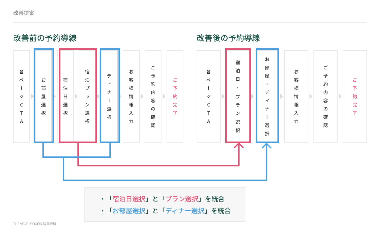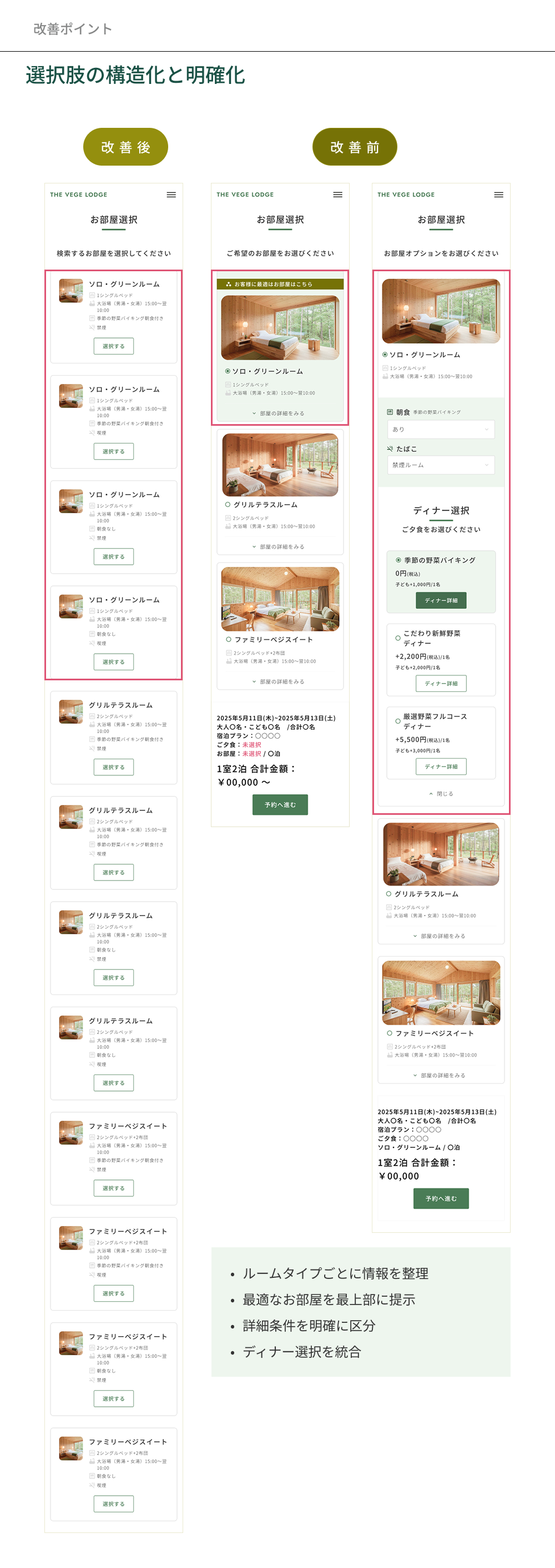 「宿泊日選択ページにプラン選択」「お部屋選択にディナー選択」を統合することで、既存の予約プロセスにおけるページ遷移数を2ステップ削減し、予約体験を効率化しました。