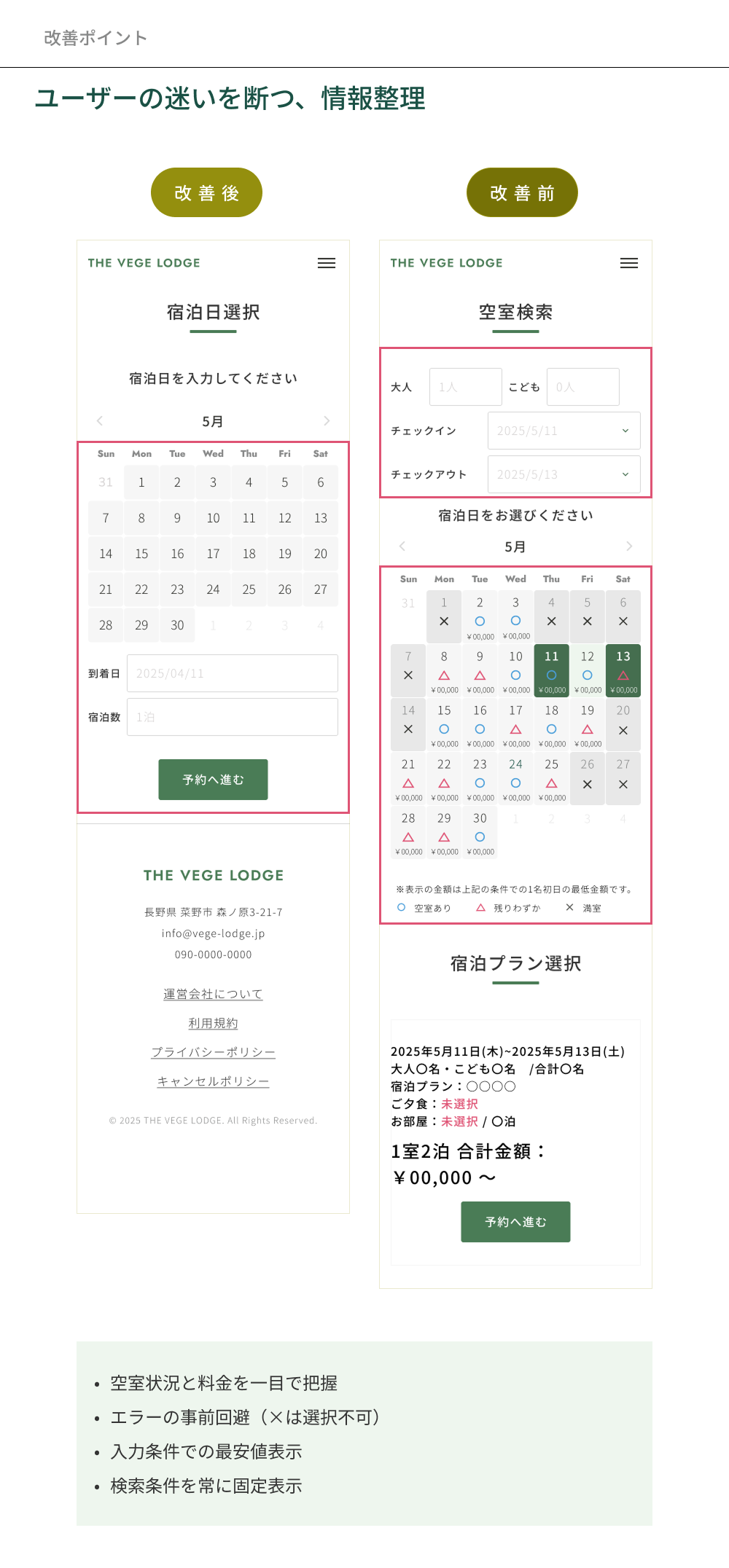この「見える化」による安心感が、お客様が自信を持って予約を進められる環境を作り出し、離脱率の低下に貢献すると考えました。