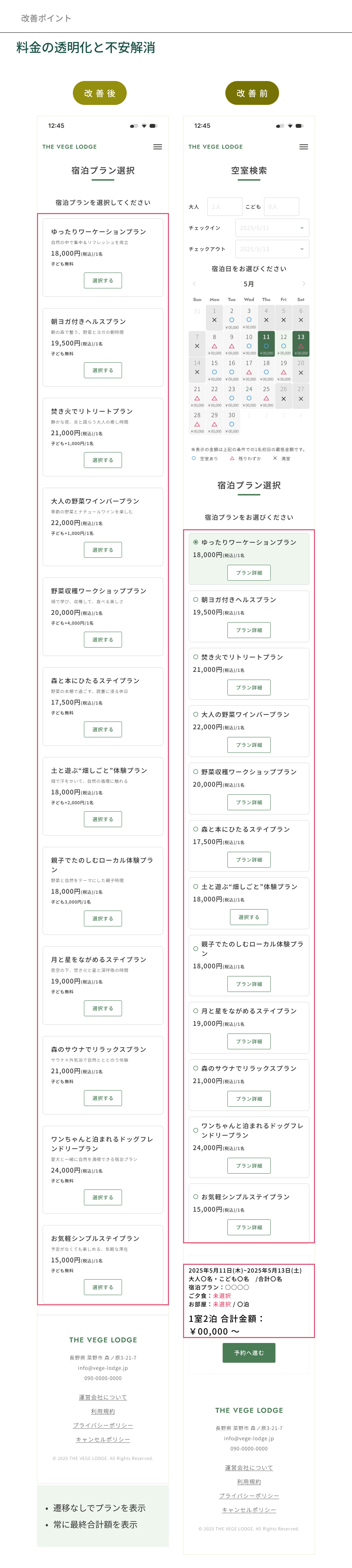宿泊日の選択直後にプラン選択画面を同一ページに統合し、ユーザーが迷うことなく次のアクションに進めるようにしました。これにより、予約フローの遷移数を削減し、操作の手間を解消します。