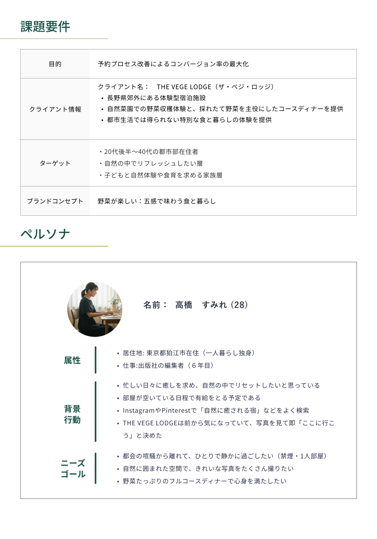 予約プロセスの各ページについて、ユーザー行動に基づいた「仮説」と「要件」を設定しました。その仮説を解決に導くため、デザインの必須条件と推奨条件を具体的に定義し、改修の指針としています。
