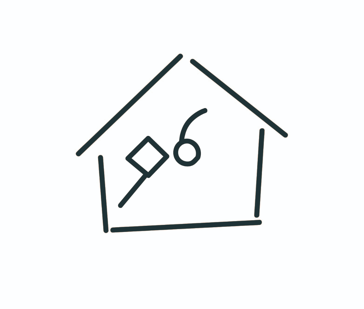 ・家の中に69を配している。6と9はそのままだと丸っこくて、シャープなオシャレ感が出ないので、作字した。9は丸いところを星のように菱形にして、6は軸がついた実のような形にしている。