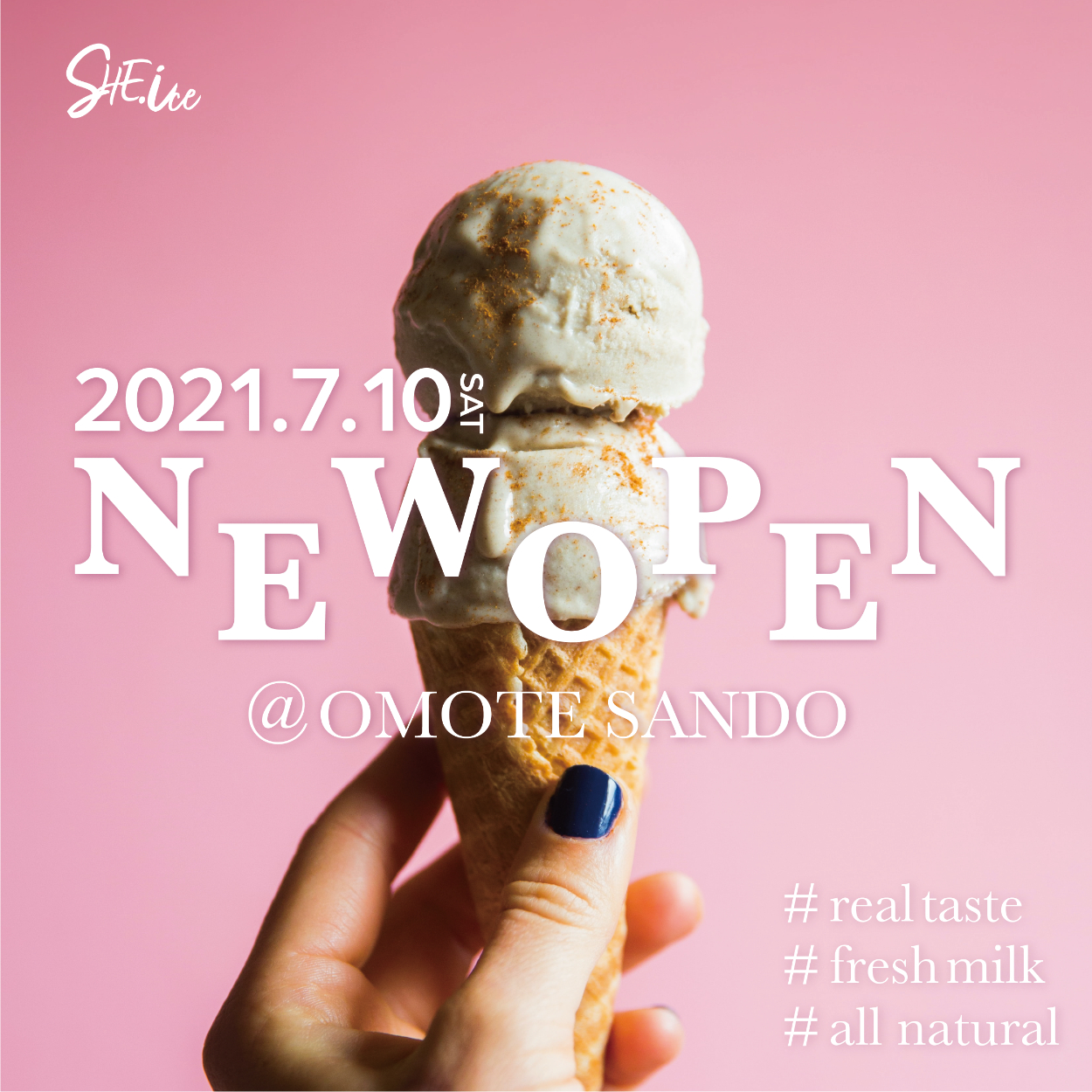 - 表参道らしさを洗練されているトレンド感と考え、デザインに落とし込むにあたっては要素をなるだけ抑えて20代が好むようなおしゃれさを表現する方向性で検討しました。NEW OPENを強く印象づけるためにも、文字の配置で遊びを出してインパクトをつけ、デザインのポイントにしました。