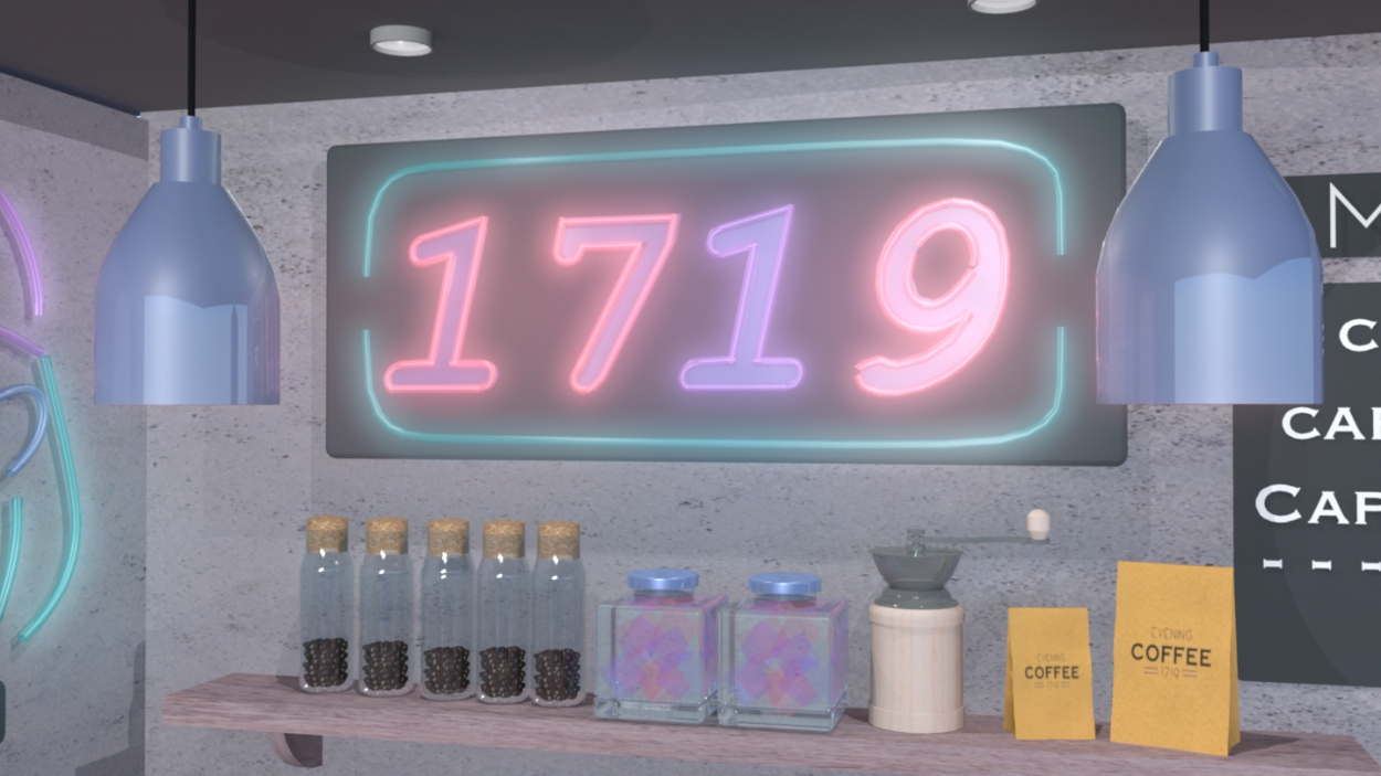 Cafe1719 Safuran. クリエイター OVERVIEW MayaでのCG作品 YEAR 2019 「夜」「秘密のカフェ」をテーマに作成した作品初めてのMayaを使用した作品制作期間は1ヶ月。ネオン管での表現にこだわって作成。