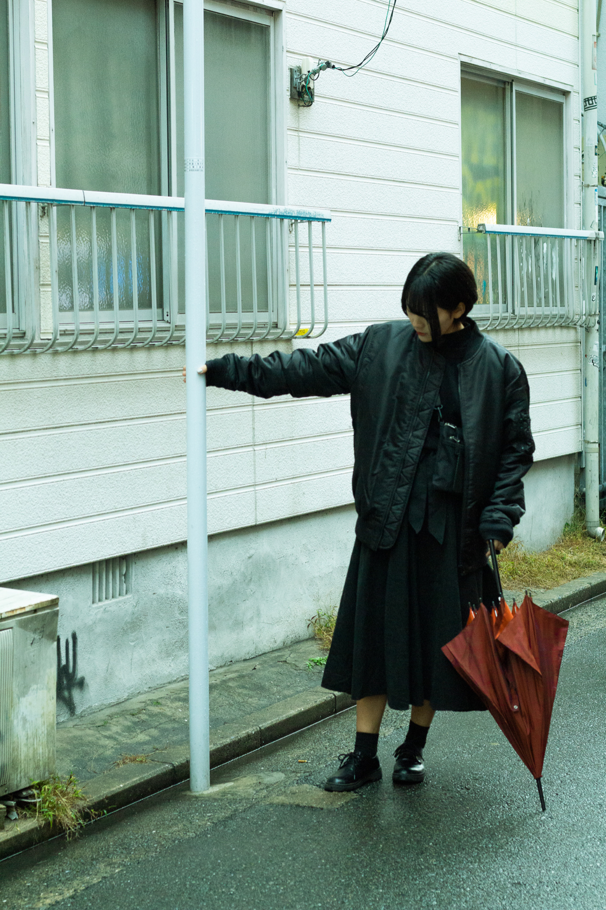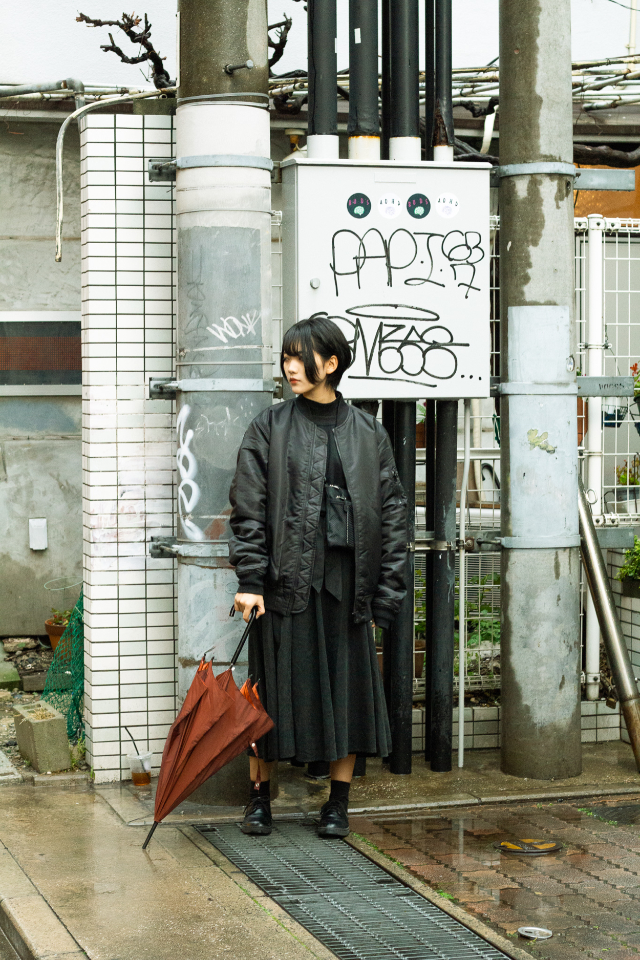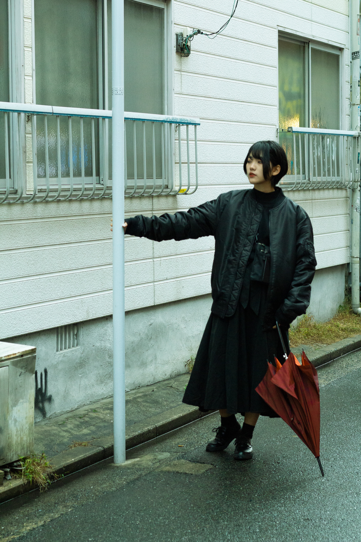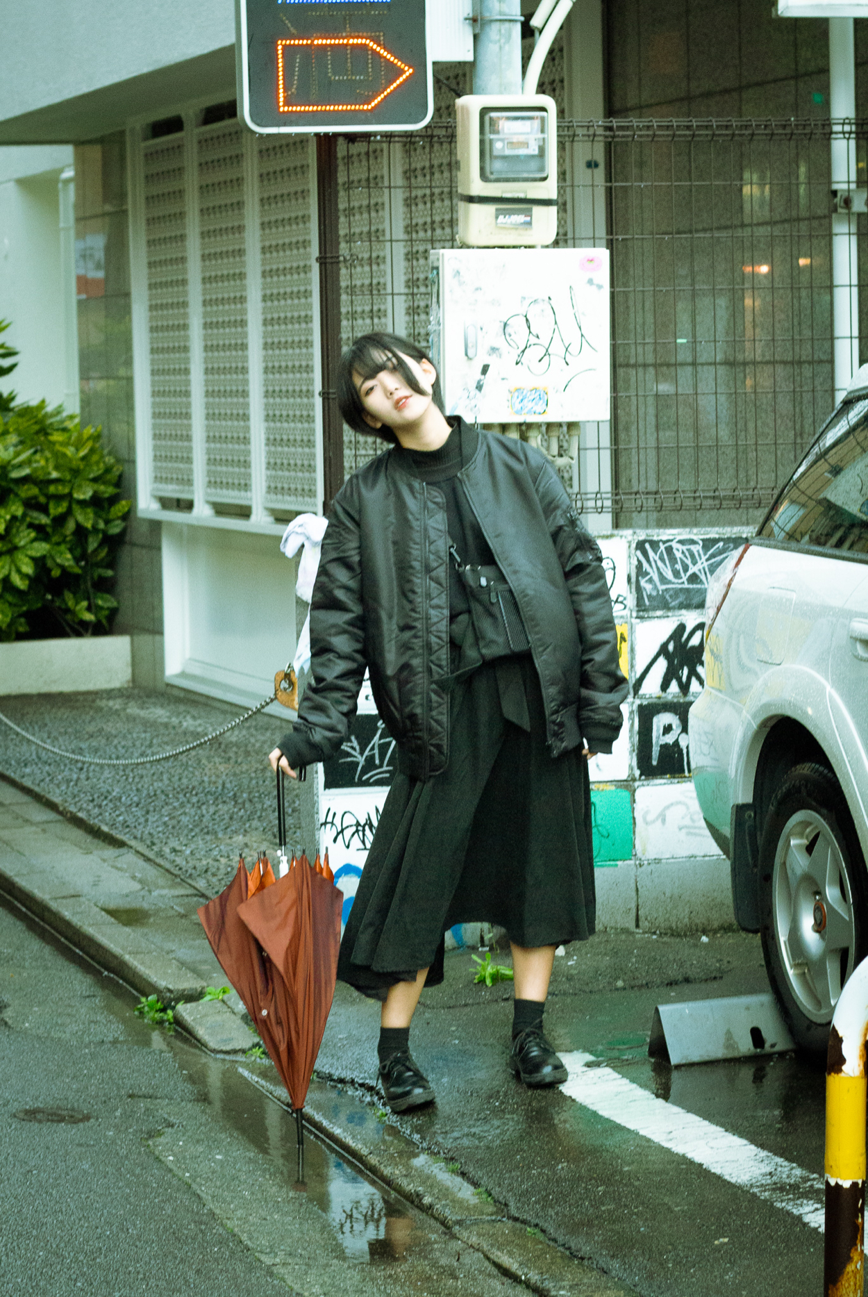 私にとって初めてのポートレート撮影でした。 被写体活動をされているじゃらさんと街中で撮影しました。雨が降っていたので物憂げで少しダークな雰囲気の写真を目指しました。