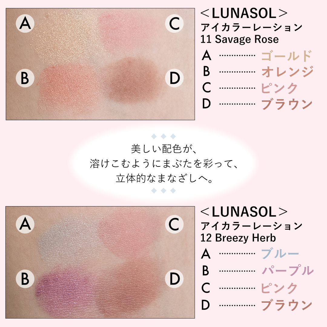 2種類のアイシャドウを効果的に宣伝するために「アイカラーレーション11番 Savage Rose」をイエベ向け、「アイカラーレーション12番 Breezy Herb」をブルベ向けとし、対比させるようなデザインにしました。