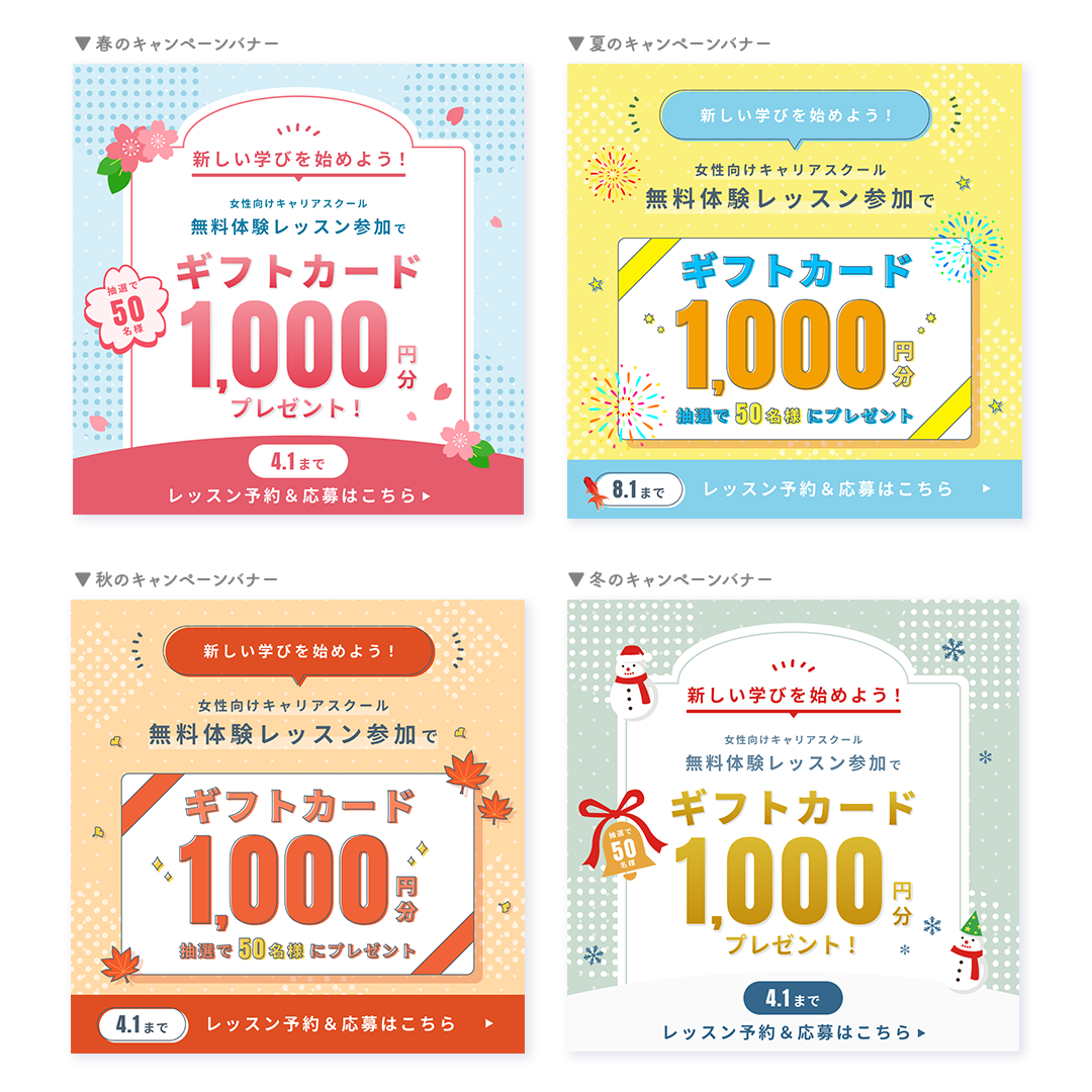 ・同一のキャンペーン内容を、季節ごとの雰囲気に合わせて展開することを目的に、春・夏・秋・冬の4パターンのバナーを制作しました。