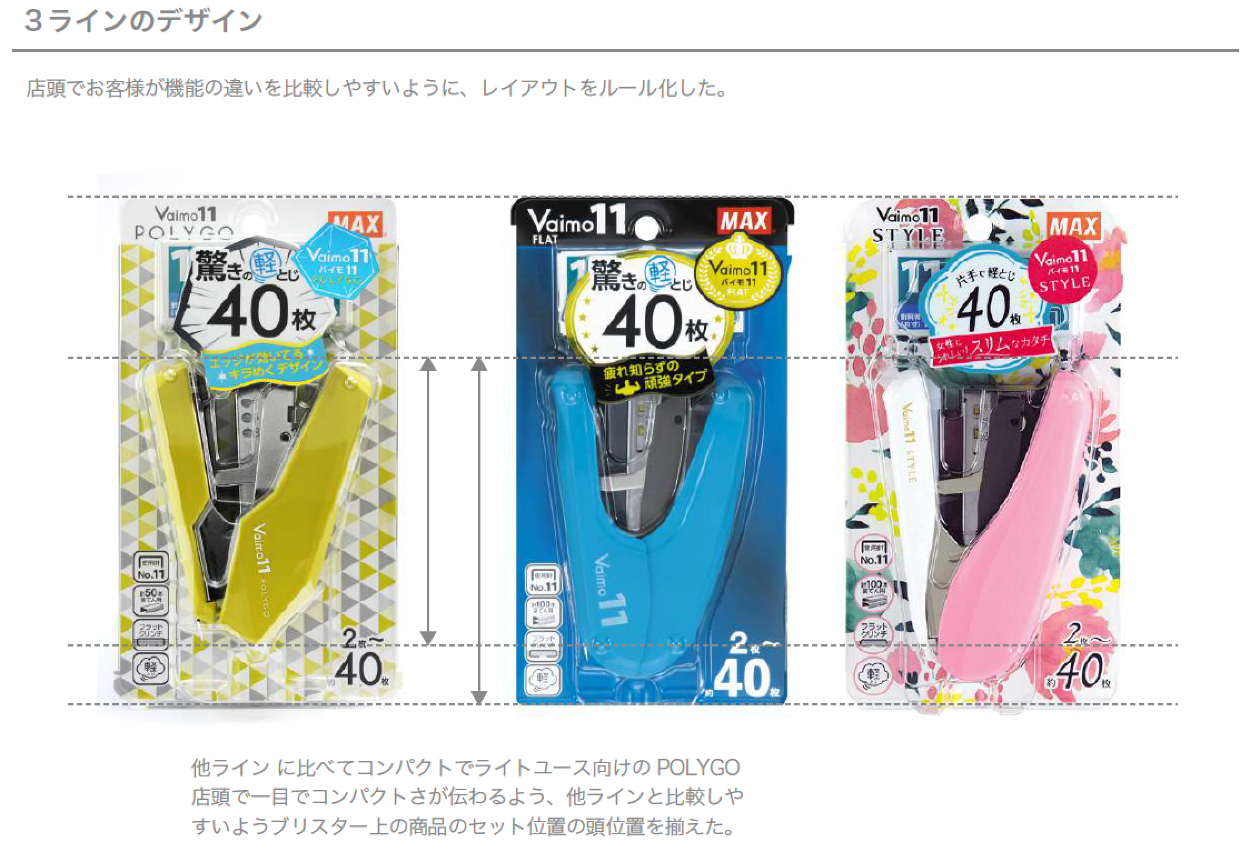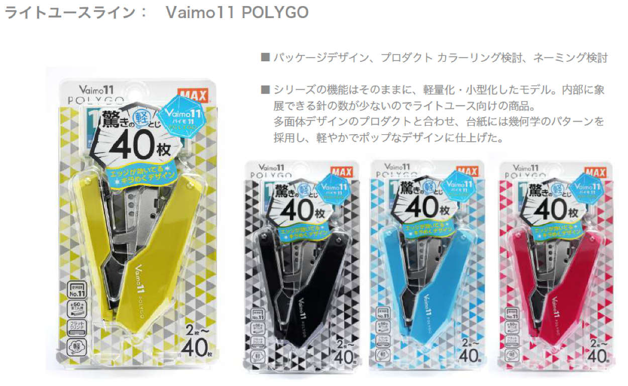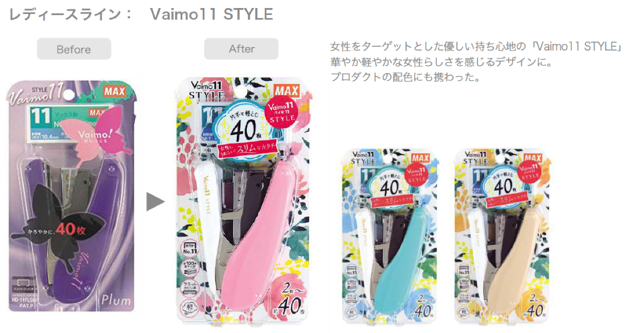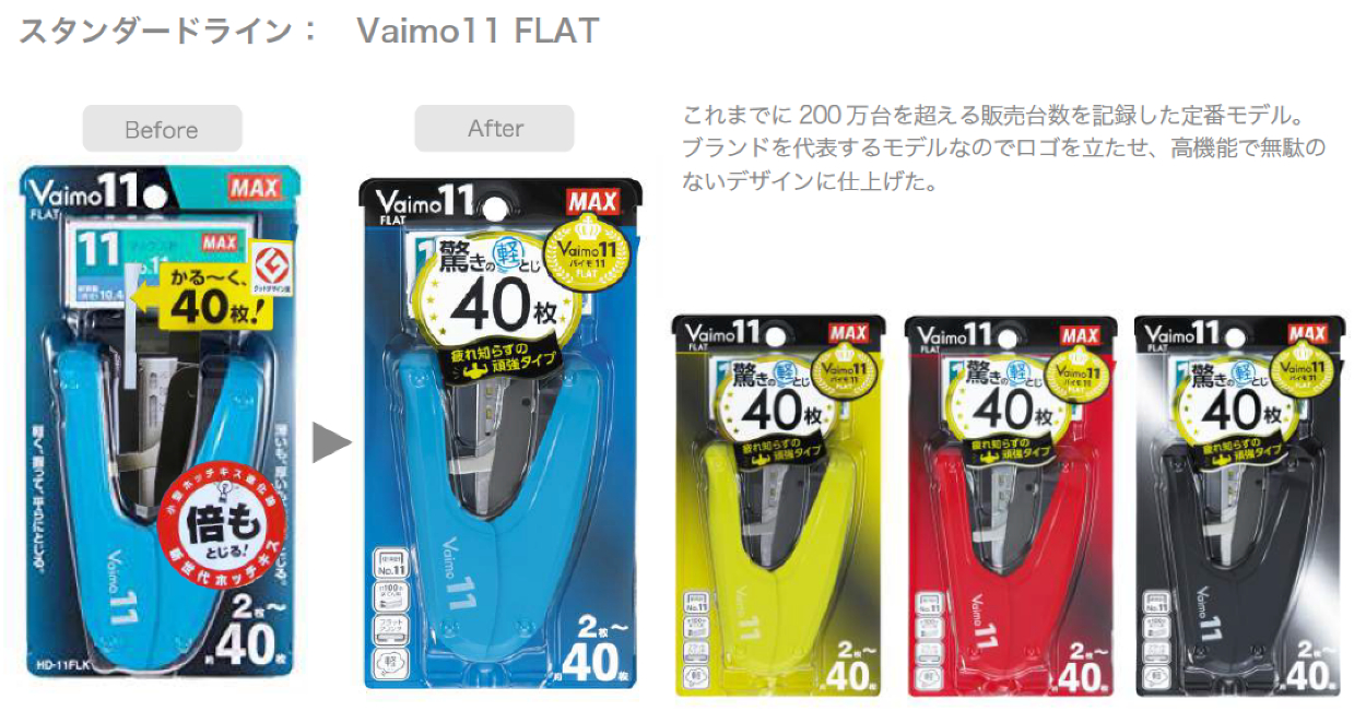 *Vaimo11(バイモ イレブン):マックスが開発したオリジナルの11 号サイズの針を使用し、薄い書類も厚い書類も針を変えることなく一台で対応することができるマックスを代表する主力ブランド。スタンダードラインのVaimo11 FLATは2008年グッドデザイン賞受賞。レディースラインのVaimo11 STYLE は2010 年に受賞。スタンダード・レディース・ライトユースの3ライン、全12SKU。