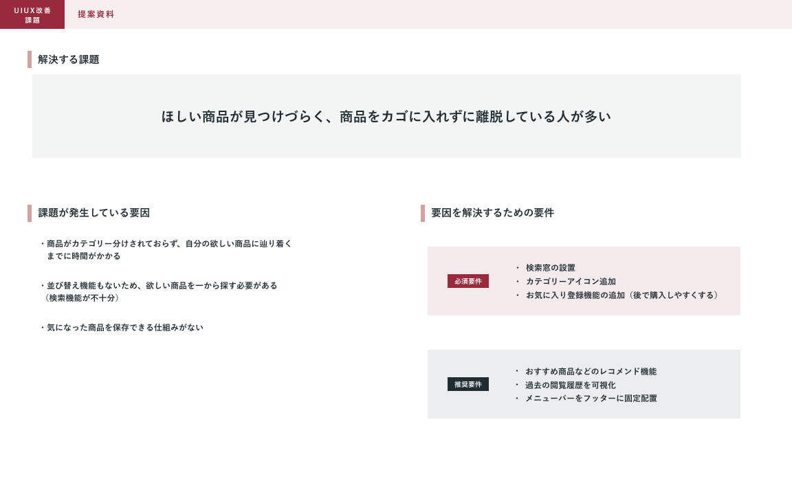 課題②:ほしい商品が見つけづらく、商品をカゴに入れずに離脱している人が多い