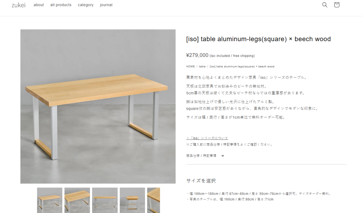 商品詳細ページでは、家具の幅、奥行、高さ、木部の表面仕上げなどをお客様に選択いただき、送信できる機能をつけています。shopifyの管理画面からお客様の選択内容を確認できます。