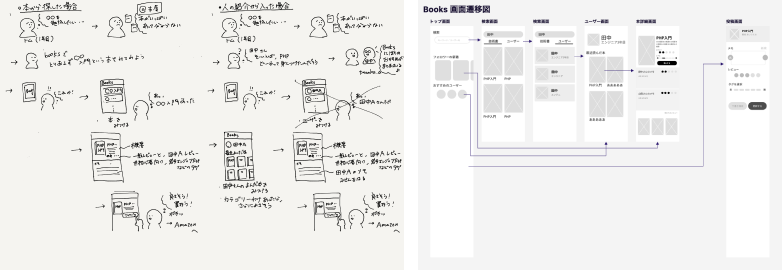 要件を定義するにあたり、ユーザーの利用シナリオを具体化し、必要な機能や導線と画面に必要な情報を検討しました。このタイミングでは、なるべく早く良し悪しがチームで判断できるように、ラフで素早く具体化することを意識して進めました。