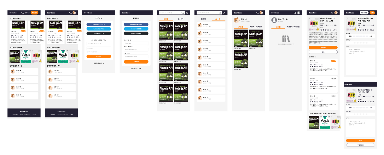 BOOKBASEのサービスのトンマナを決める為に、既存類似サービスの調査やサービスを象徴するキーワードの洗い出しを行った。定義したトンマナをUIに展開しました。