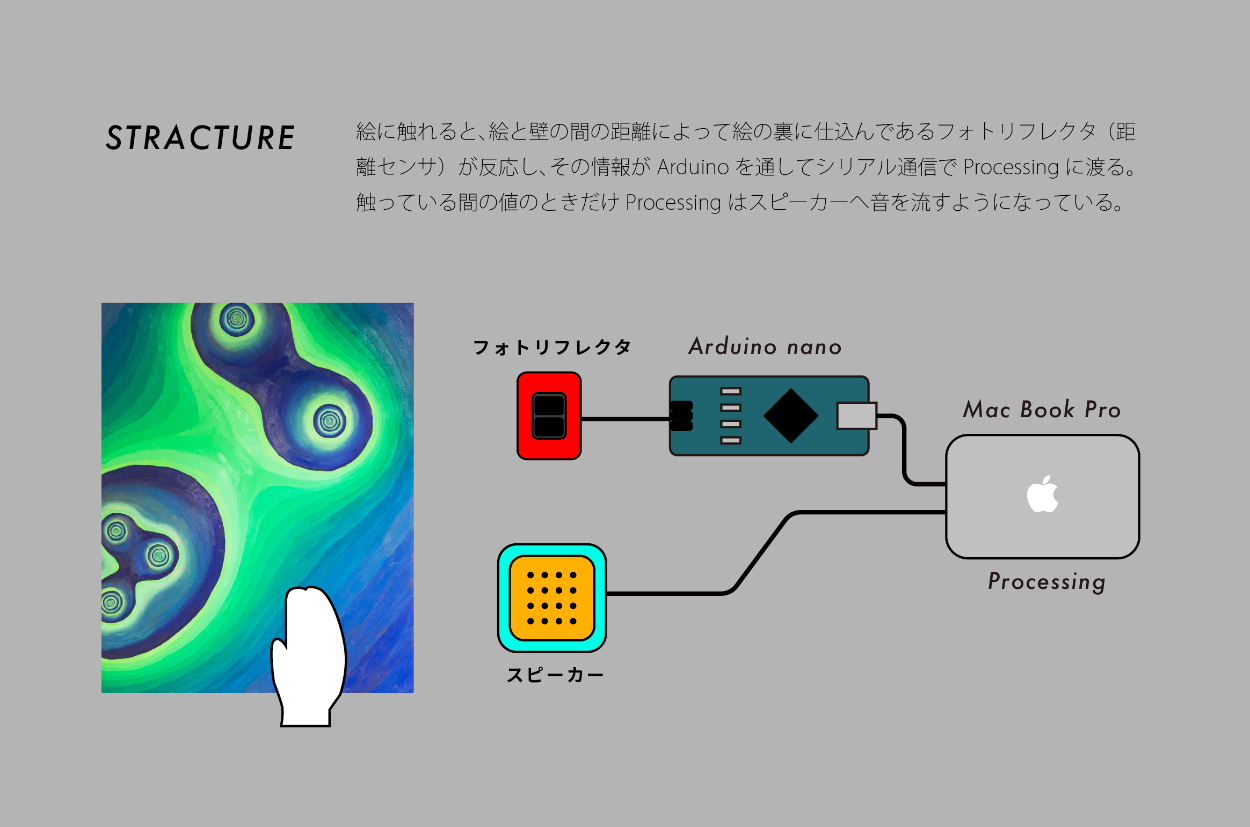 油絵の裏にフォトリフレクタを貼り付け、シリアル通信でProcessingに値を送信、触られたときの油絵と壁の距離の閾値を設定し、触っている間だけスピーカーに音を流した。