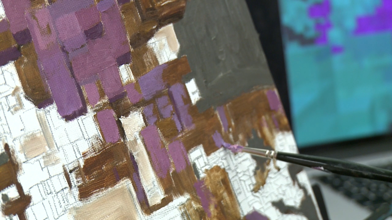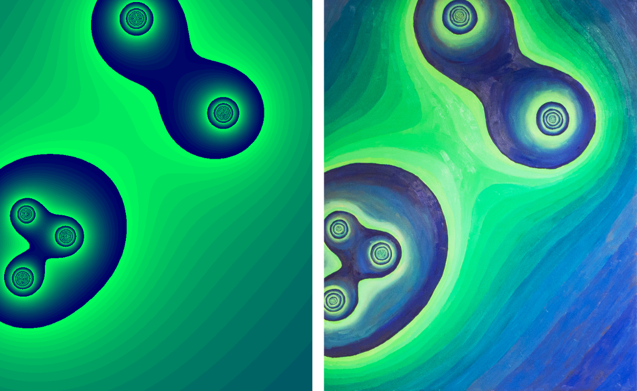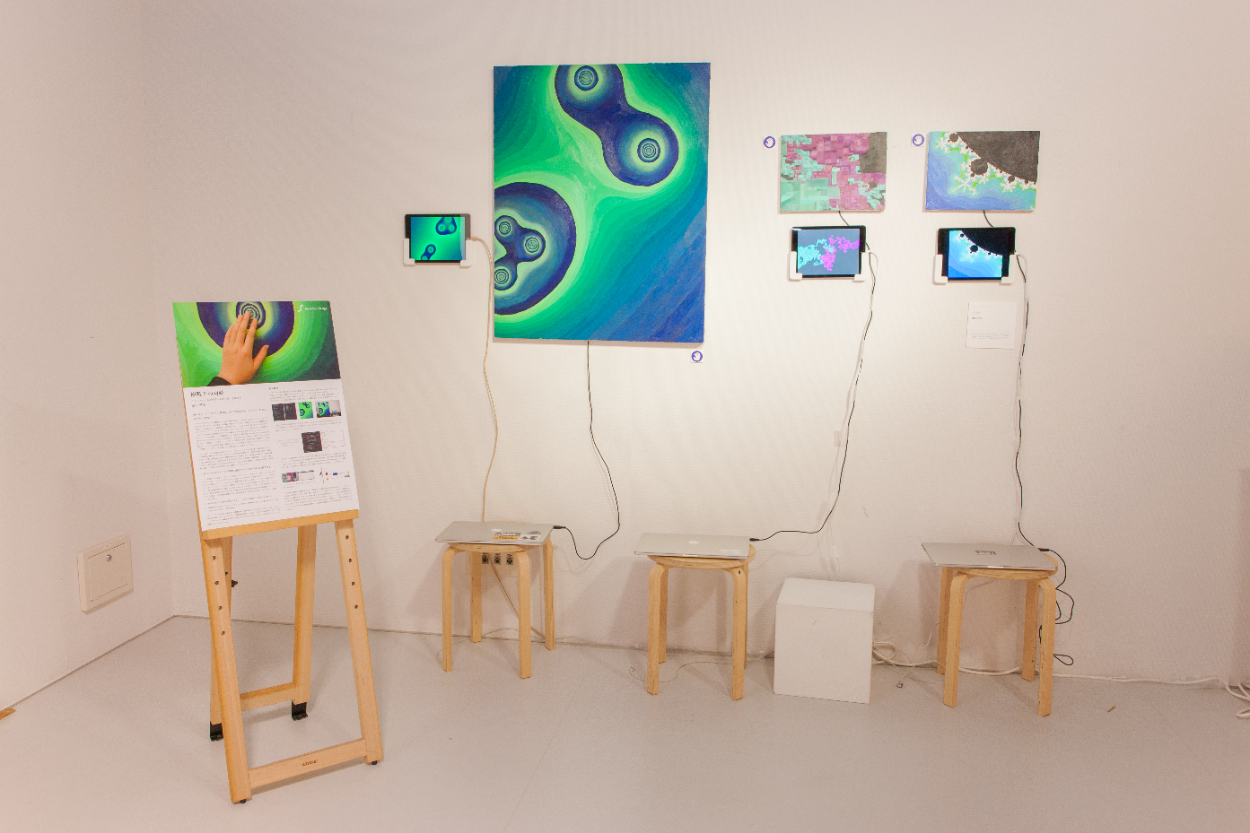 油絵の題材と音は全てアルゴリズム由来のもので、1つのアルゴリズムからopenFrameworksで油絵のもととなるグラフィックを生成、Processingで音を生成している。この作品では「メタボール」「ランダムウォーク」「マンデルブロ集合」の3つを形にした。
