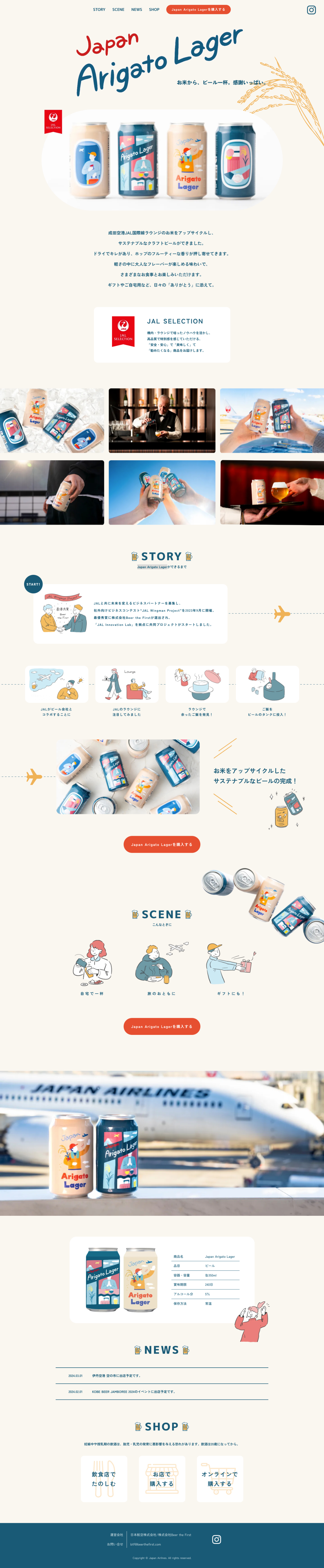 JALの社外向けビジネスコンテスト“JAL Wingman Project”にて最優秀賞を獲得した株式会社Beer the FirstとJALの共同プロジェクトで作られたクラフトビール『Japan Arigato Lager』のLPデザインを担当しました。