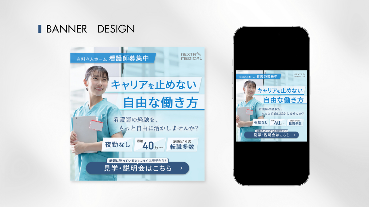 老人ホームの看護師募集を目的とした求人バナーの自主制作。 医療・介護業界での制作経験を活かし、「働き方の魅力がひと目で伝わる」ことをテーマに、情報整理と信頼感のあるビジュアル設計を行いました。