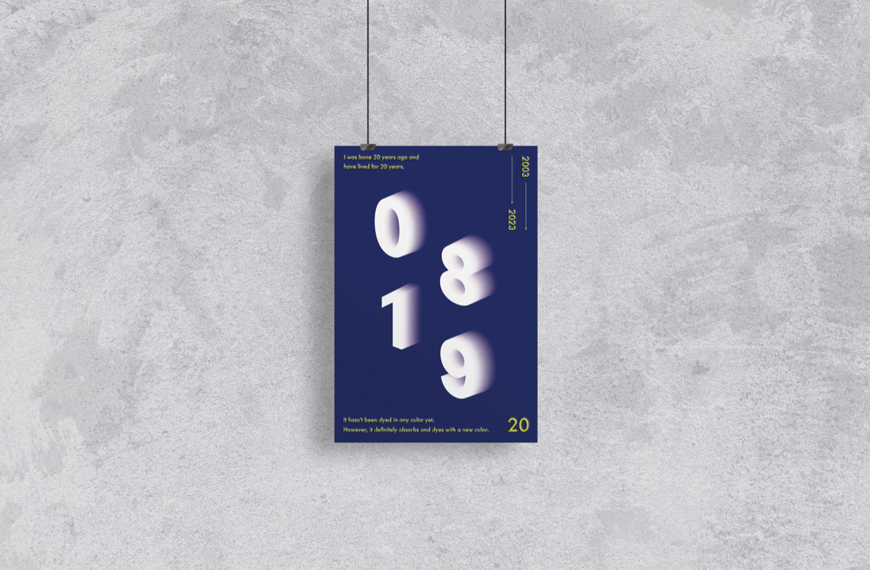 メインモチーフの数字は表面の白と背景色にかけてグラデーションにすることで、まっさらだった私は様々な物事を吸収し、新たな色、つまり新しい自分に変化していく様子を表現した。