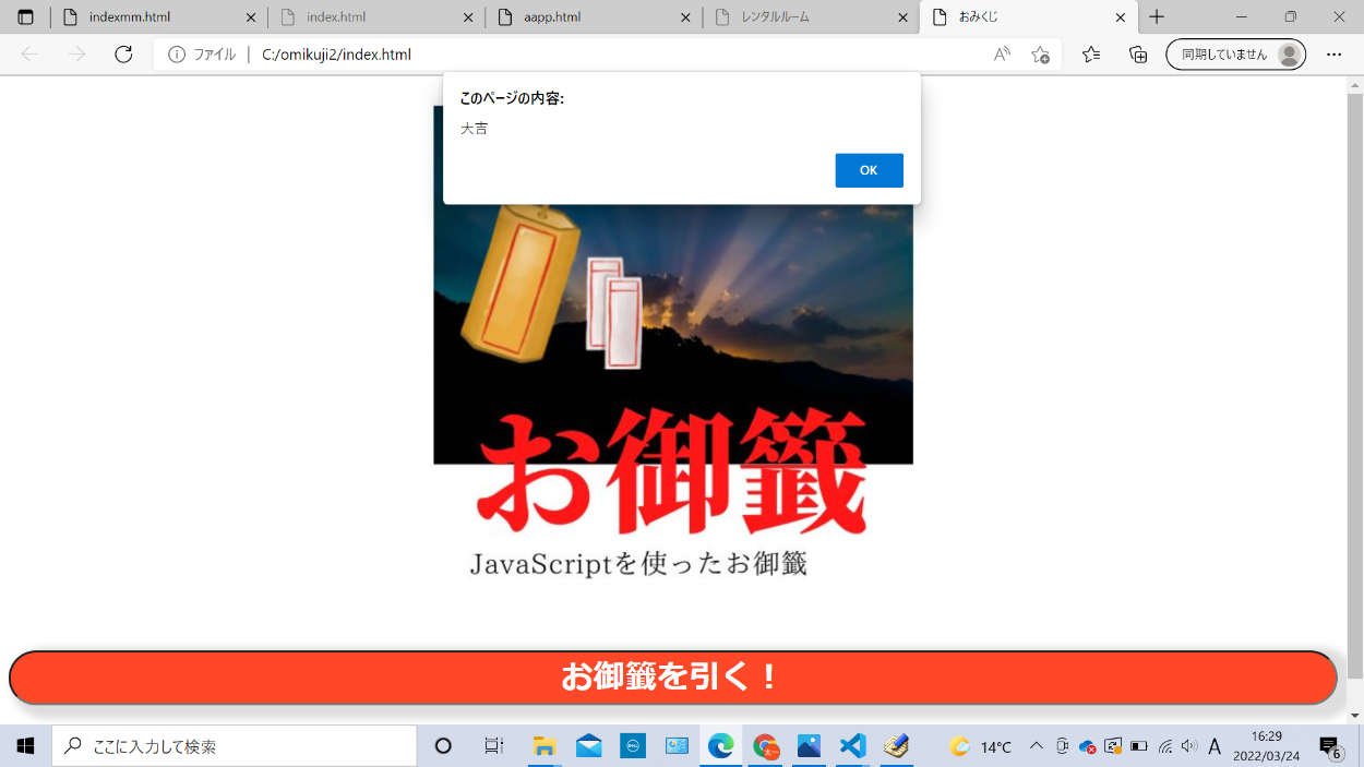 お御籤を引くというボタンを押すとこのようにJavascriptのalertで結果が表示されます。