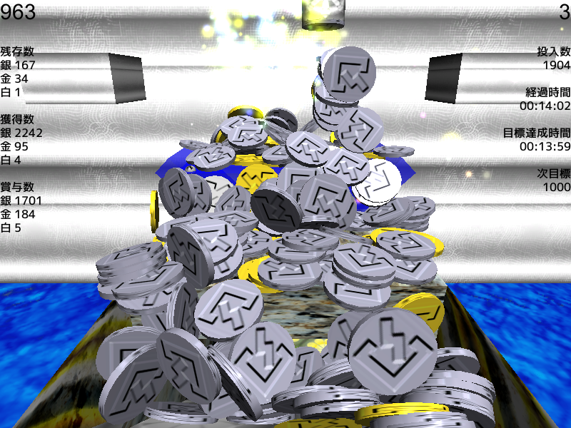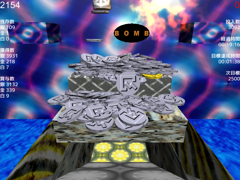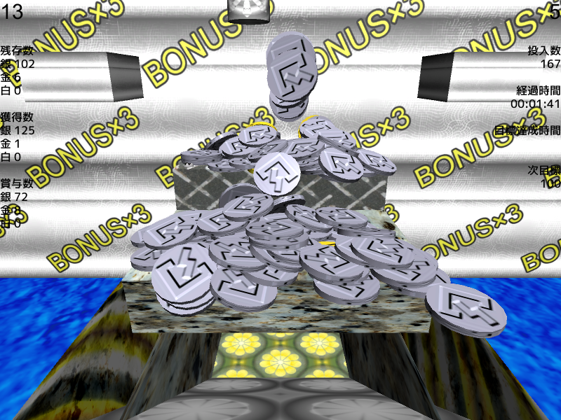 ゲームセンターのメダルゲームコーナーに置いてある「プッシャーゲーム」を、3Dゲーム制作ソフト「Unity」を使用して再現したものです。