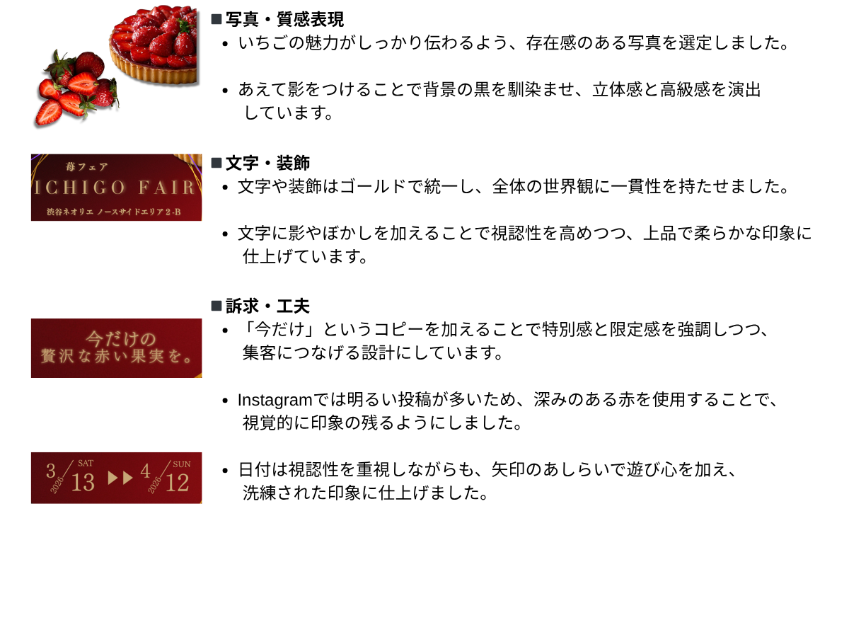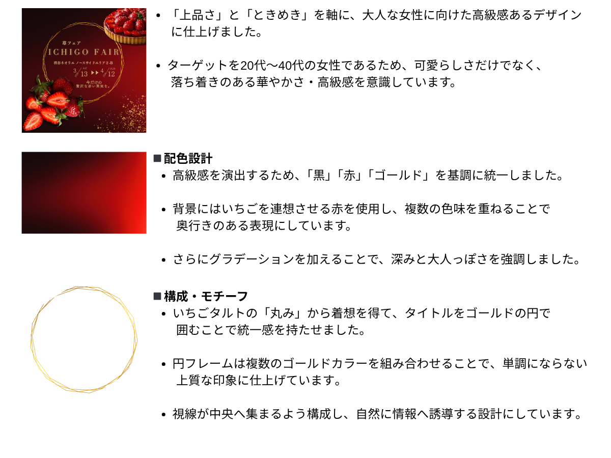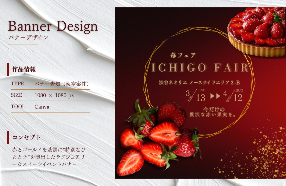 【バナー】いちごフェアイベントの告知 おと WEBデザイナー OVERVIEW ターゲットに対して直感的に「高級感」と「特別感」が伝わるよう、配色・構成・視線動線を意識して作成しました。 YEAR 2026 【制作物】【要件】⚫︎制作目的イベント集客を目的としたInstagramの広告バナー⚫︎ターゲット20〜40代女性⚫︎ご要望PNG(1080×1080)で納品【デザインの意図】