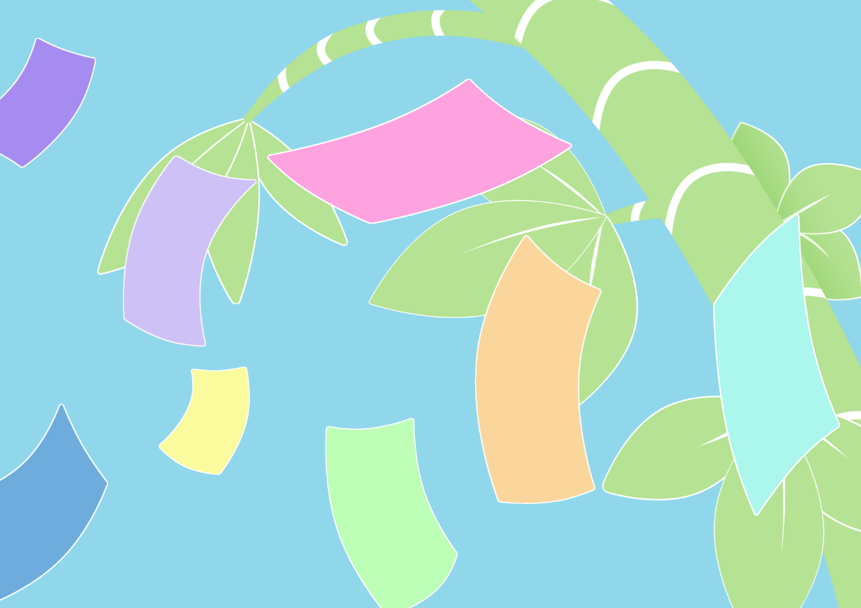空色と、モチーフに七夕を使ってほしいとの事だったのでメインカラーに空色を添えつつ、七夕の笹を書いてみました。短冊が飛んで行って天の川に届くイメージです。