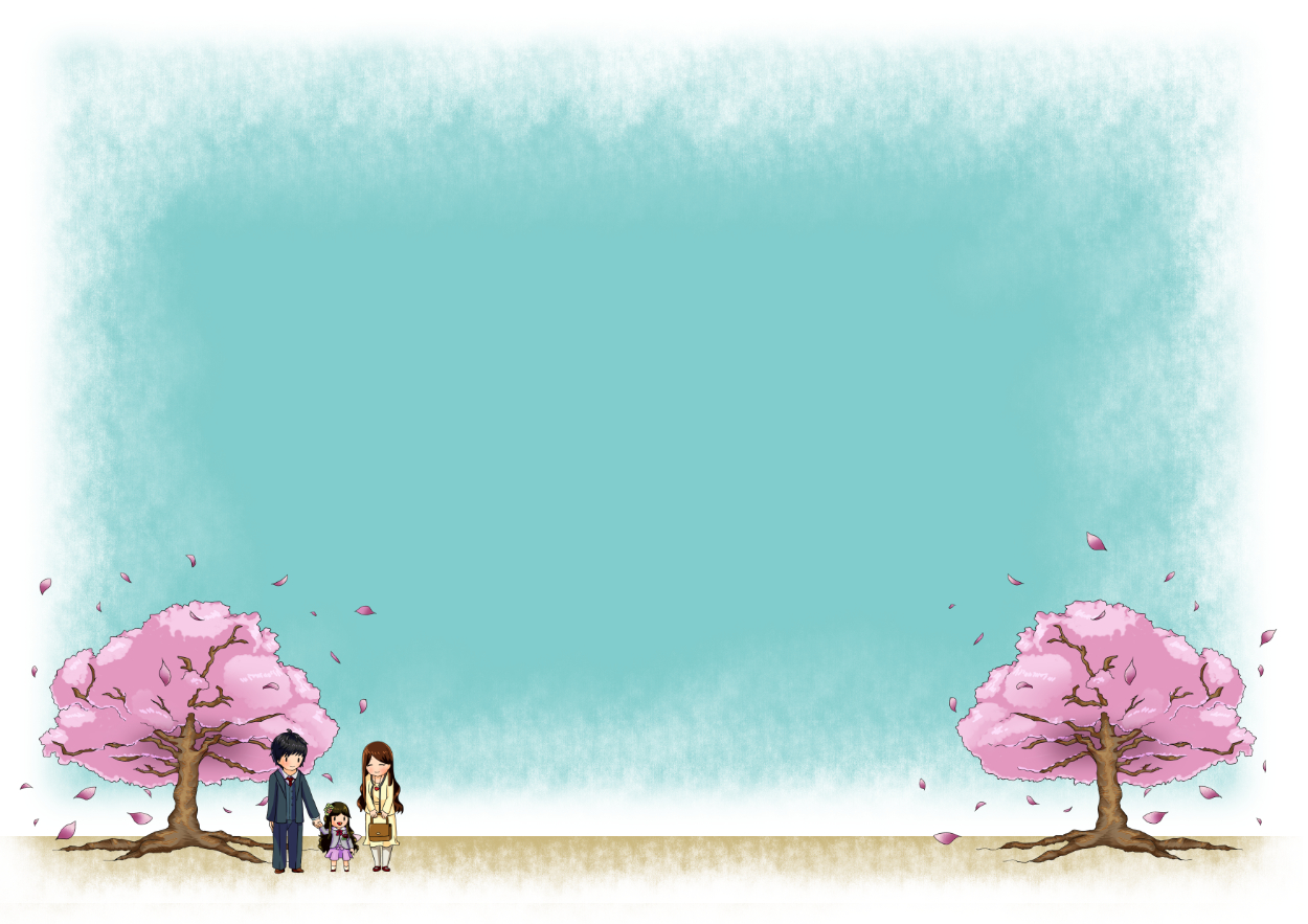 4月という事で、桜と入学式の親子を入れてみました。新年度のわくわくしている気持ちを出すために晴れ晴れとした青空を一面にしました。