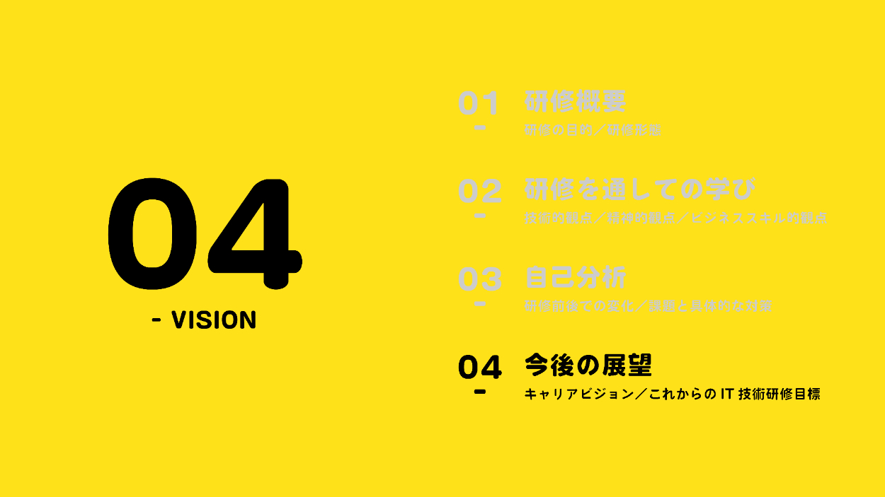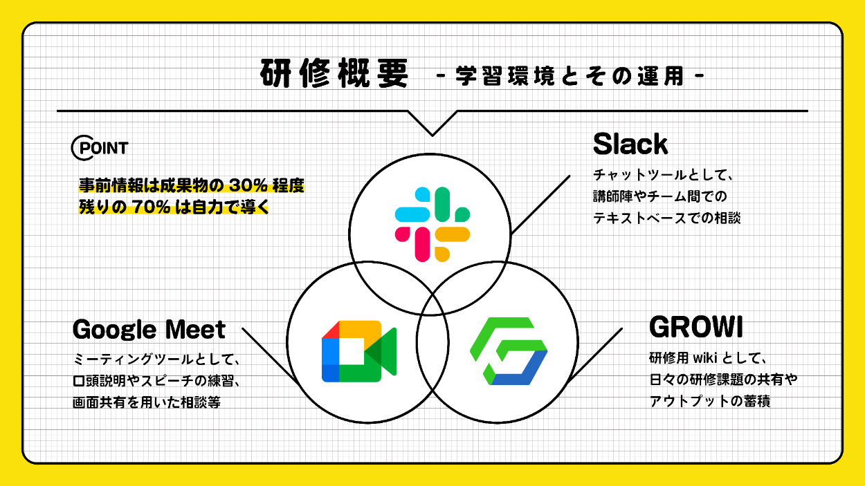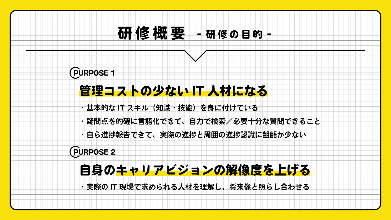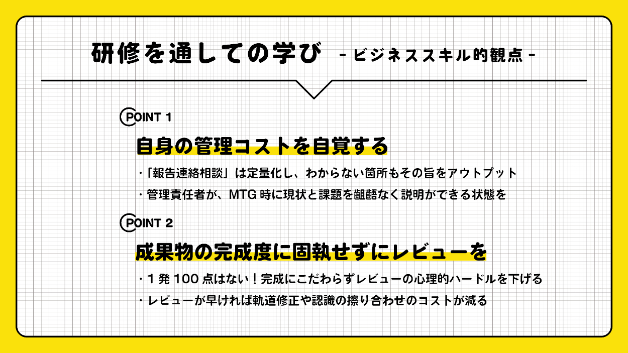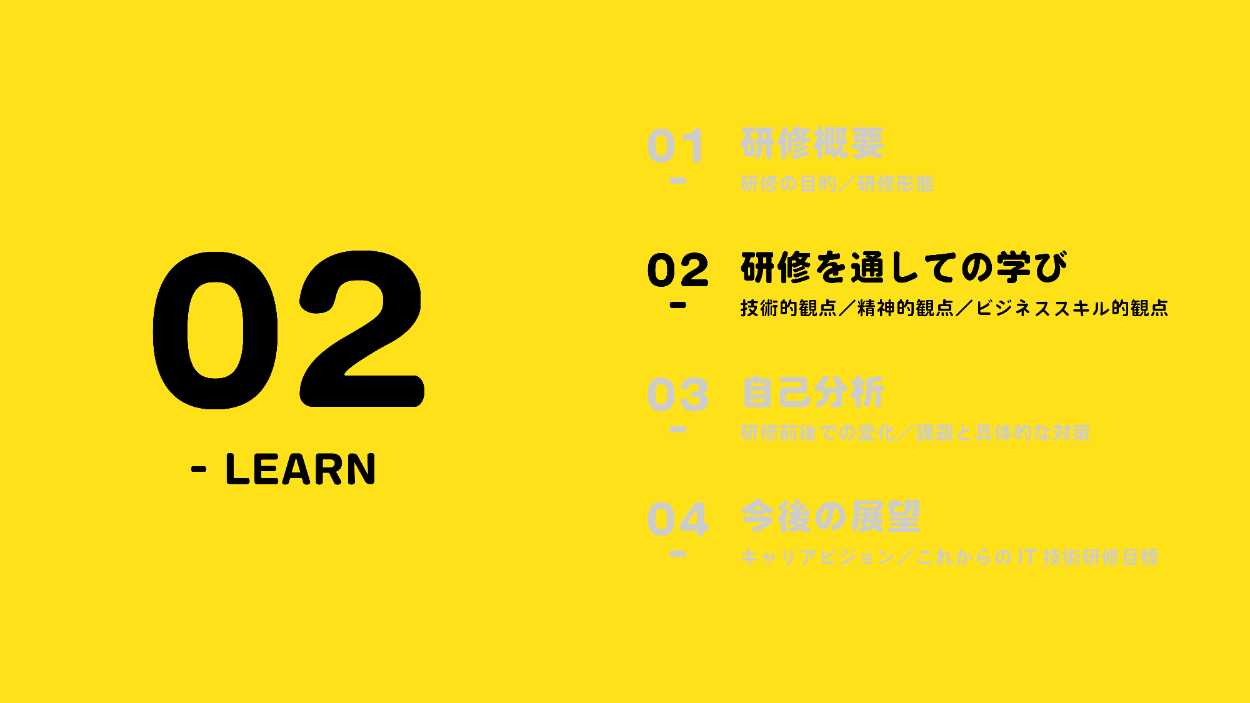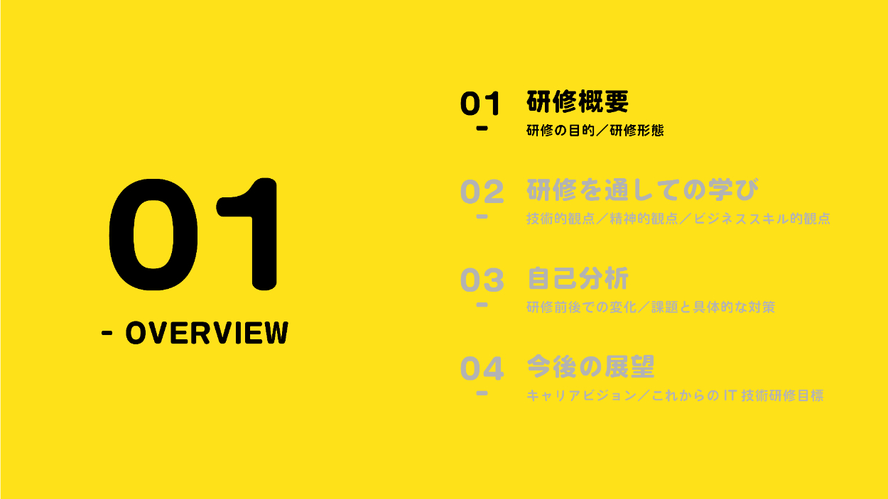 2021年4月製作。 社外で受講していた新人研修について、社内向けに報告するための資料として作成。プレゼン利用の他、ドキュメントとしても利用できるようにテキストに重きを置いてデザイン。また、新人らしく快活な印象になるようトンマナを策定した。