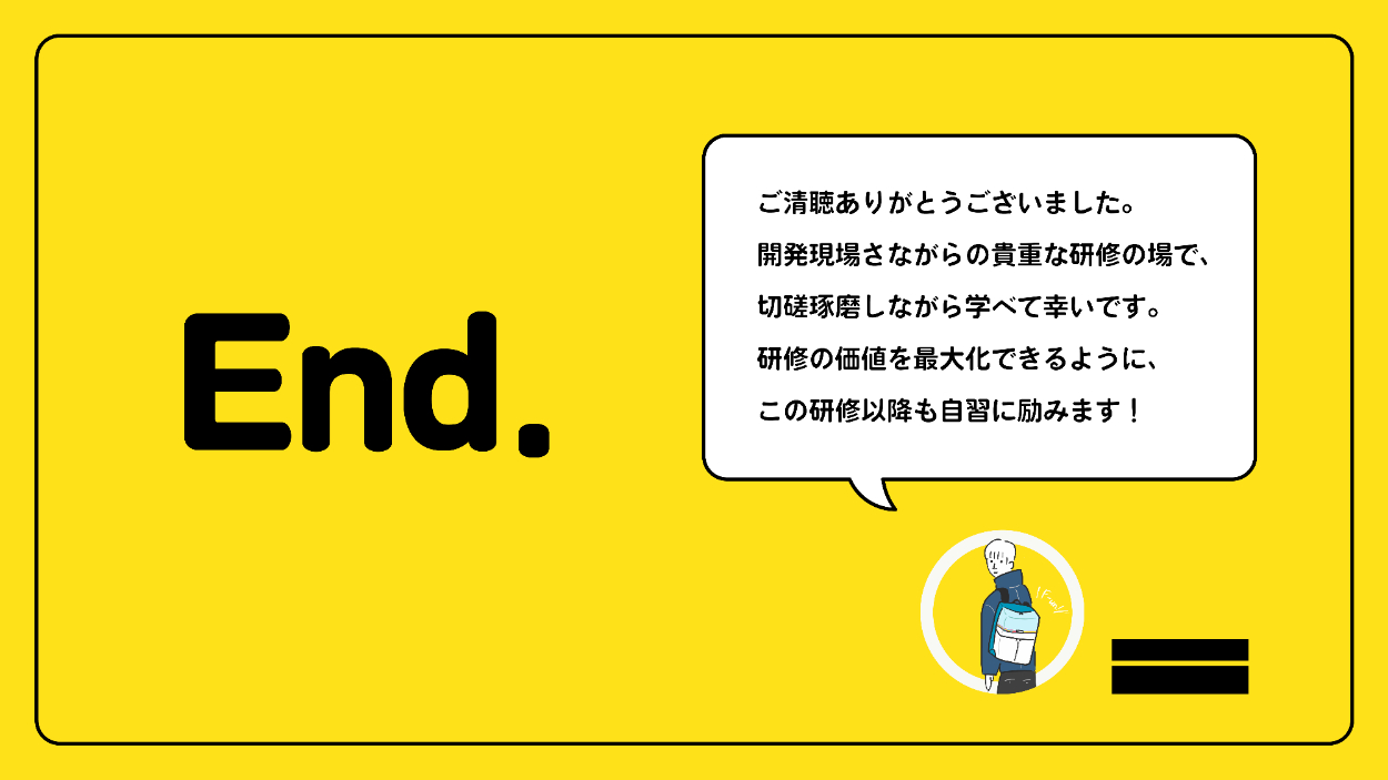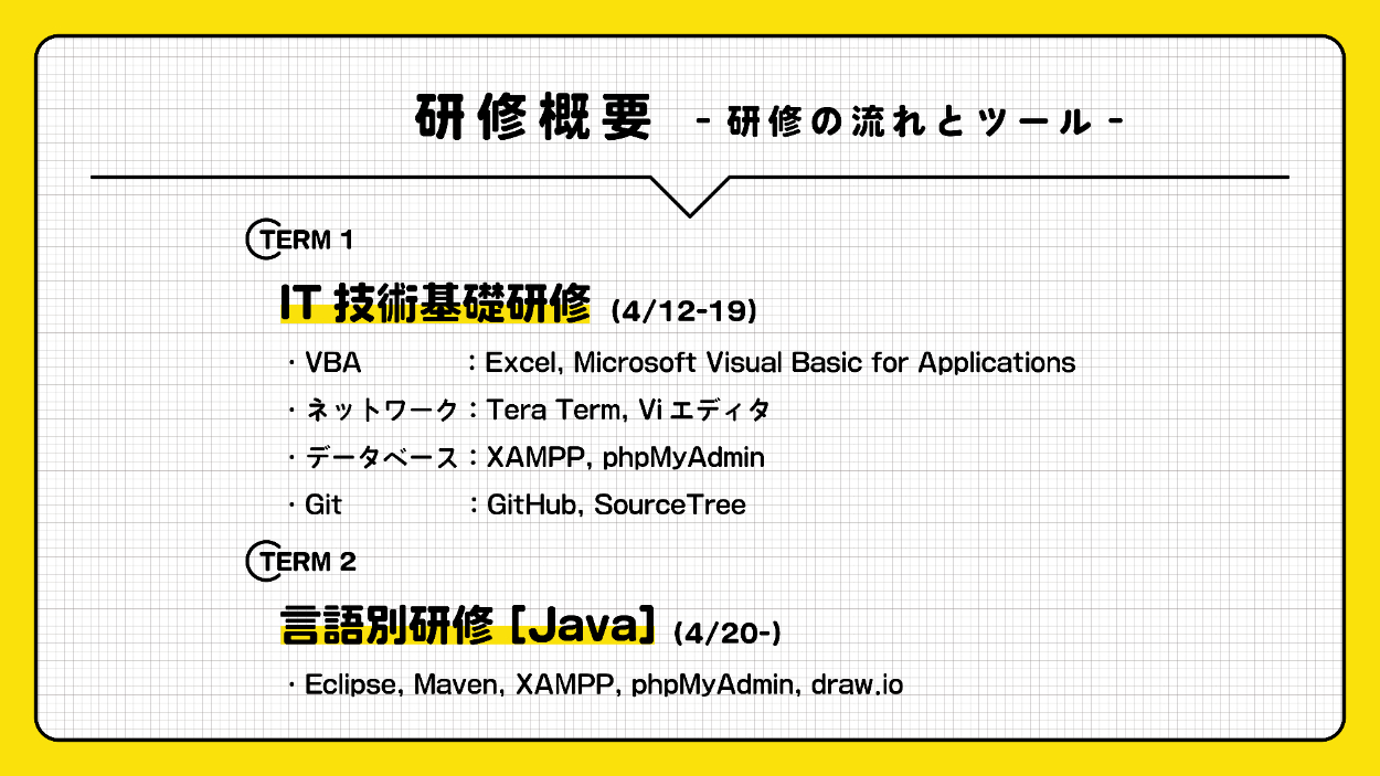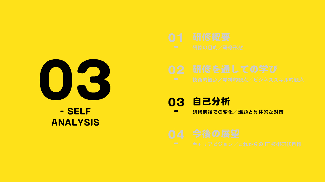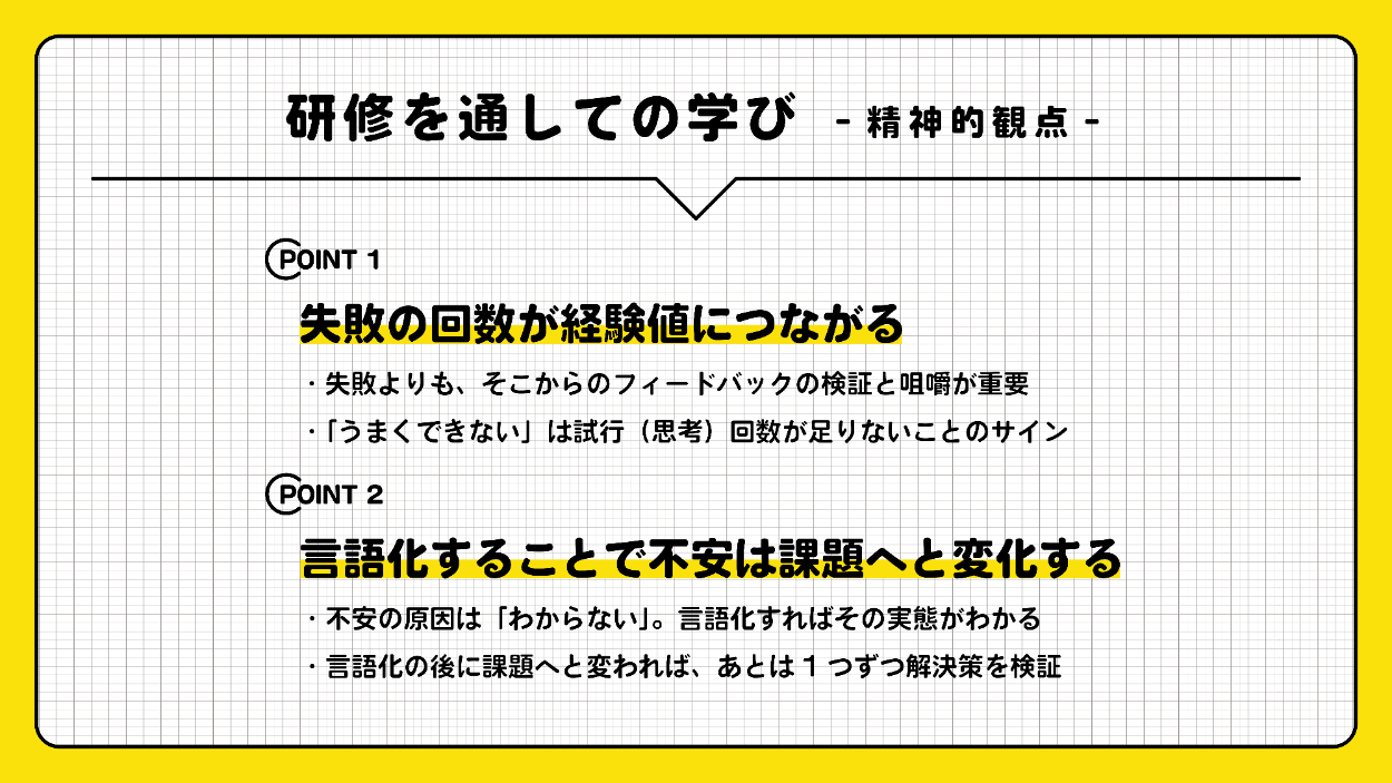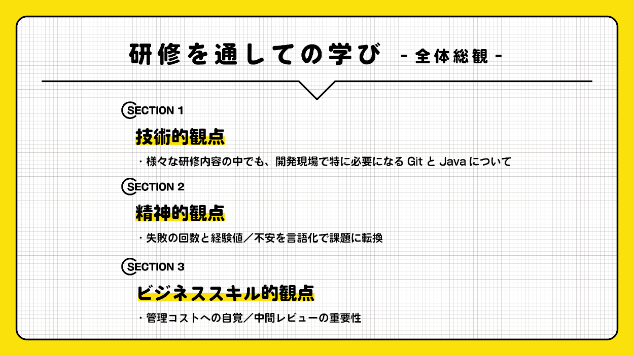 2021年4月製作。 社外で受講していた新人研修について、社内向けに報告するための資料として作成。プレゼン利用の他、ドキュメントとしても利用できるようにテキストに重きを置いてデザイン。また、新人らしく快活な印象になるようトンマナを策定した。