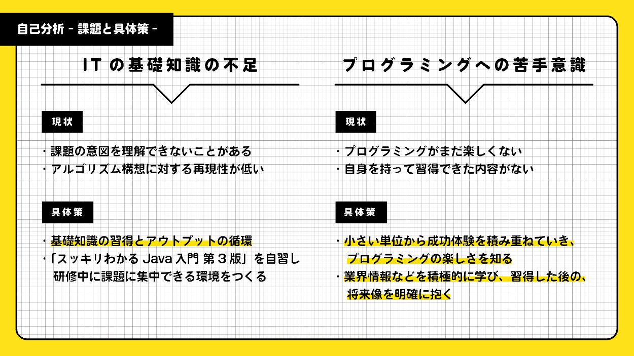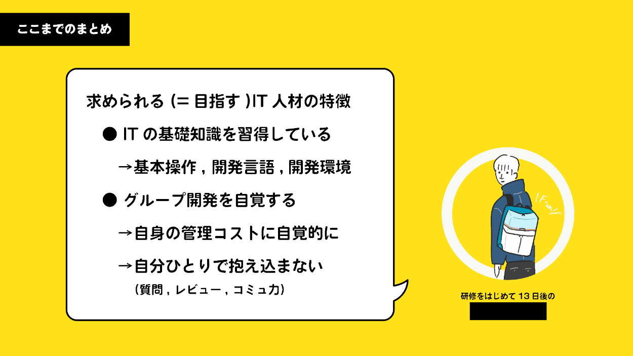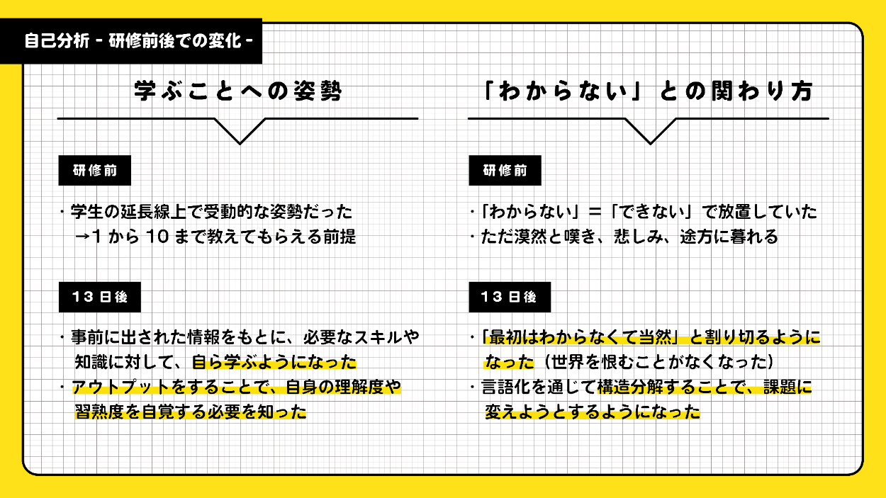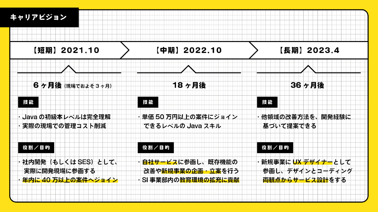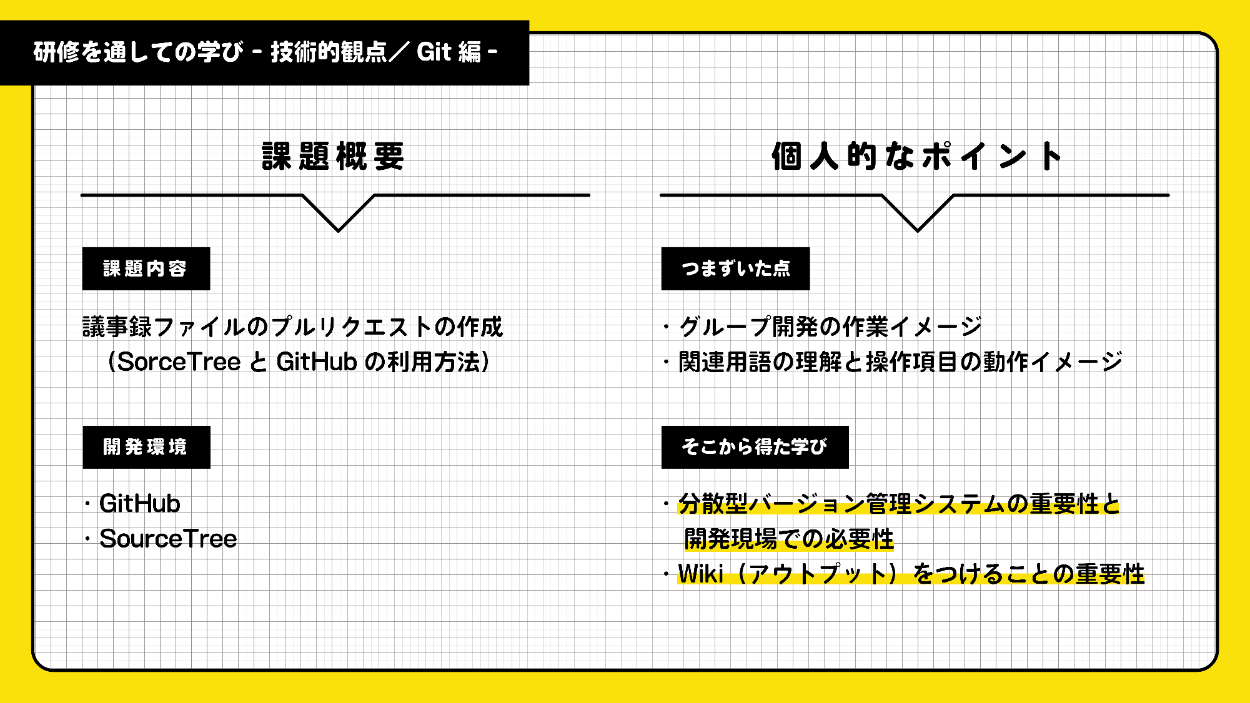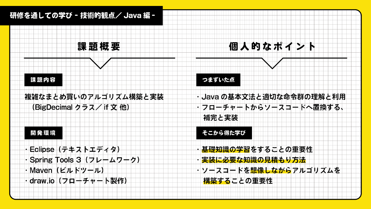 2021年4月製作。 社外で受講していた新人研修について、社内向けに報告するための資料として作成。プレゼン利用の他、ドキュメントとしても利用できるようにテキストに重きを置いてデザイン。また、新人らしく快活な印象になるようトンマナを策定した。