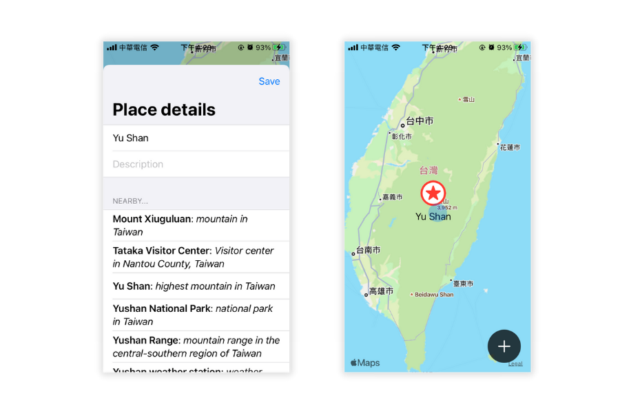 By tapping location mark "☆", the modify sheet will popup up from bottom. user can modfiy name and description. Below the text field, there is a list showing location suggestions, provided by Wikipedia API.