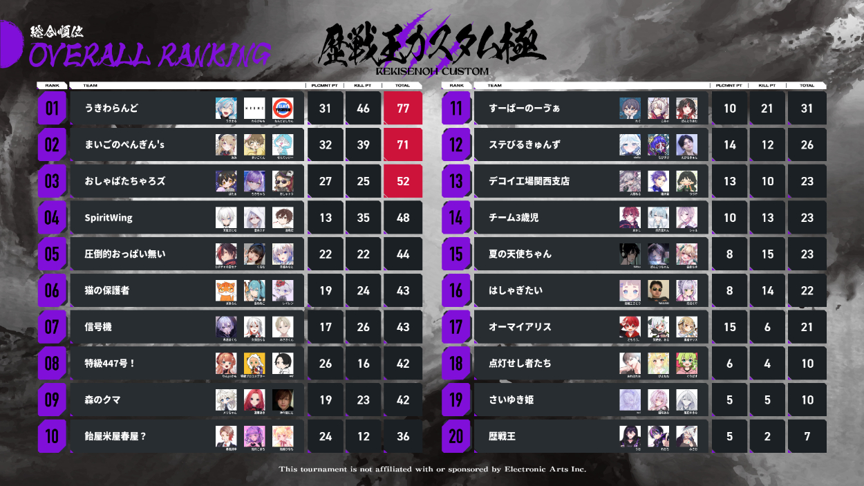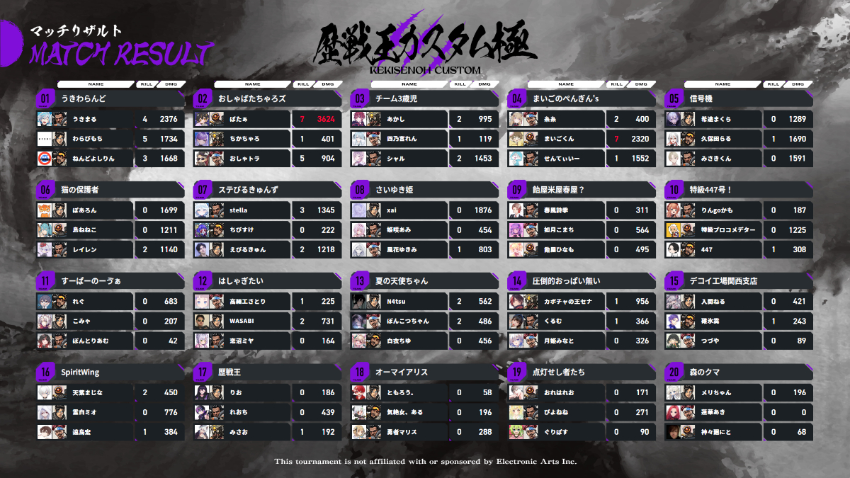 Apexカスタム大会である歴戦王カスタム-極-にてスコア表プログラムを担当しました。 ゲームAPIからスタッツデータを取得し集計を自動で行いOBSでグラフィックを送出できます。※グラフィックデザインは行っていません、コーディングのみです。