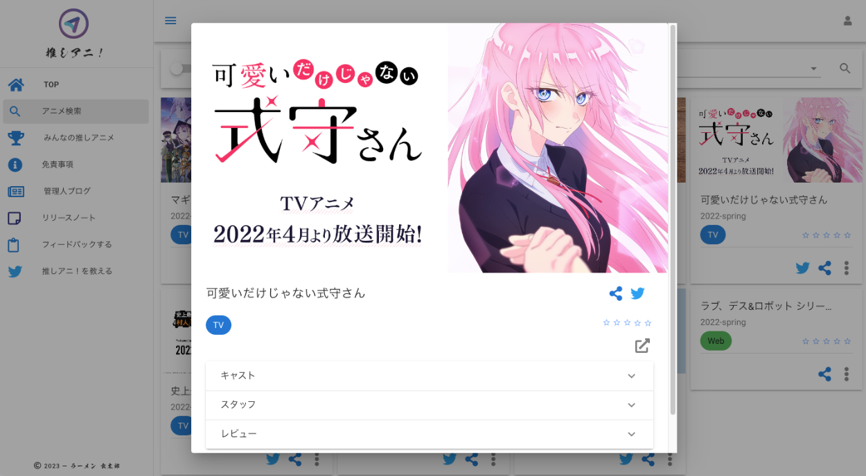 アニメレビューアプリ Kanon Otaku Developer Advocate OVERVIEW アニメ情報の検索と、自分の推しのアニメを紹介できるアプリ『推しアニ!』 YEAR 2021 - 2021 アニメの詳細情報を表示することが可能。キャスト情報の詳細表示他にもレビューをしたりもできます。ただし現在進行中の別のOSSへ移行を検討中。 WEBSITE