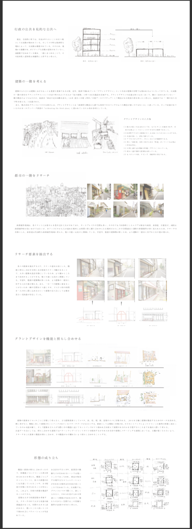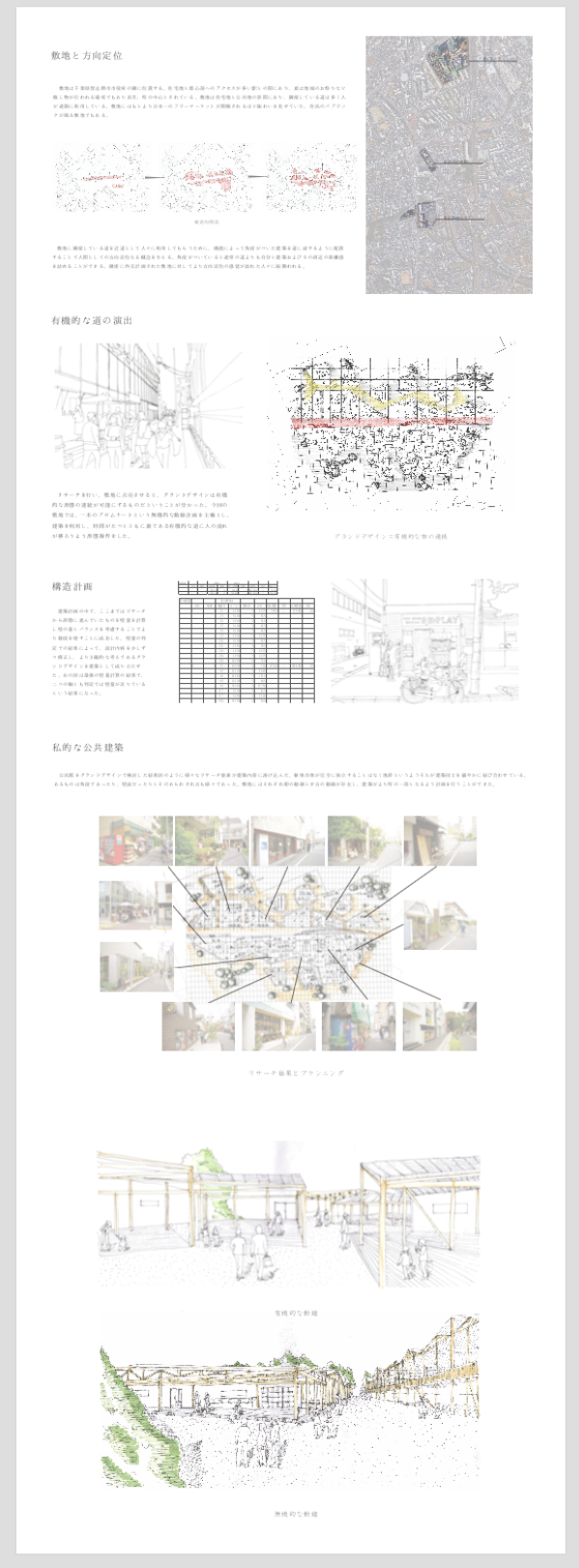 提案:今回私が採用する手法としてグランドデザインを掲げている。グランドデザインは、もともと経済学の言葉で、「地域ごとの特性や、多彩なロジックにより一階の在り方を考え直す」と定義されている。今回の設計では、都市の要素を参考にする。町にある限られたポテンシャルと都市の要素でグランドデザインを再定義することで、一般的なプロトタイプとして提案することができる。