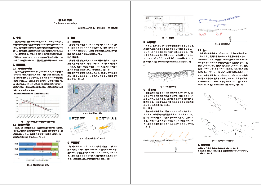 提案:墨田区の区内産業の一つである江戸切子のガラス工房と一体となるシェアハウスを提案する。地域に新たなコミュニティの形をつくり、伝統工芸の再興と共に、若い後継者不足を解消することを目的とする。