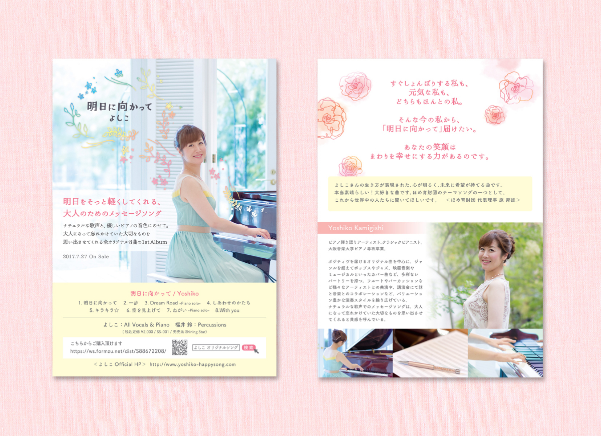 アーティスト「よしこ」さんのCDジャケット兼歌詞カードのアートワークを担当しました。 よしこさんの澄んだのびのある声のイメージがそのまま伝わるよう、シンプルで躍動感のあるイラストを散りばめました。