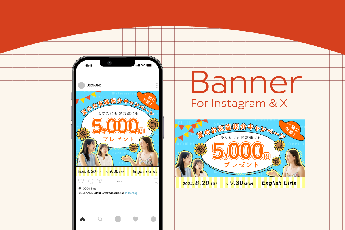 5,000円プレゼントを中央で強調しつつ、キャンペーン名や期間、ロゴを上下にまとめて整理するレイアウトでわかりやすくまとまっていると思います。
