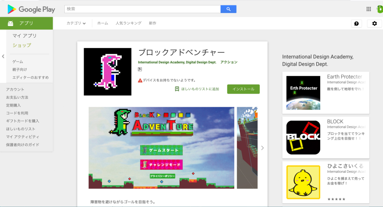 Unityでのゲーム開発をしGooglePlayでアプリ配信しました。 https://play.google.com/store/apps/details?id=jp.ac.ida.BLOCKADVENTURES