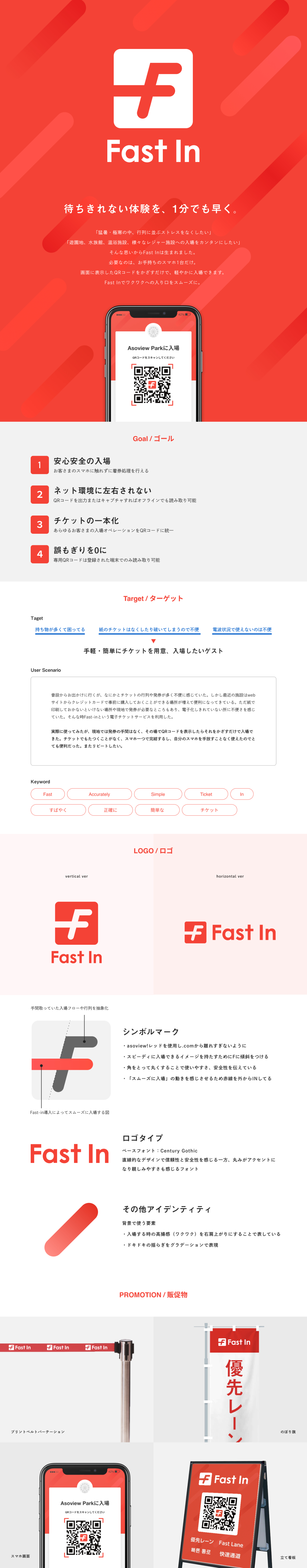 Fast In | アソビュー! 長倉 雄希 プロダクトデザイナー OVERVIEW QRチケットのサービスロゴと販促物のデザイン concept making / logo / key visual / copywriting / User scenario YEAR 2019